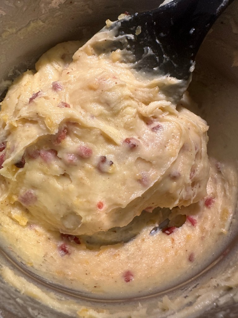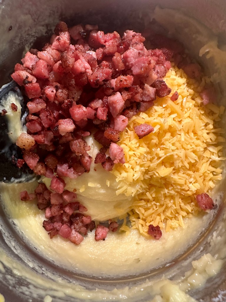 Bland fyldet i dejen og kom den i en sprøjtepose, så er den nemmere at arbejde med. Sprøjt små toppe ud på bagepapiret. Sæt i ovnen ved 200 grader i ca. 20 minutter – tjek dem gennem glasruden efter 15 minutter – skal være gyldne.