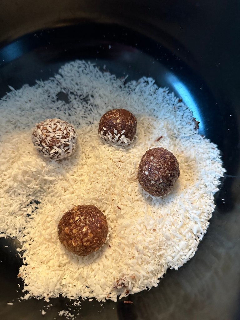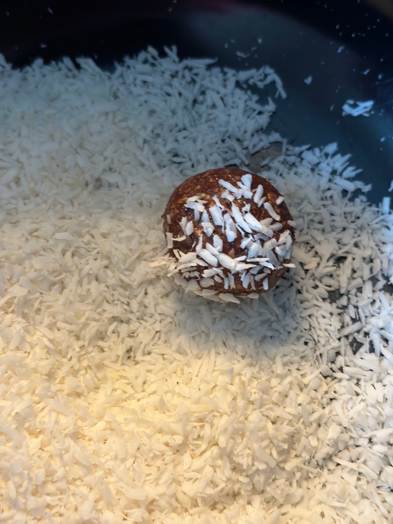 Smøret skal være blødt, og ellers blander man blot alle ingredienserne. Dejen er ofte ret “fedtet”, men det er blot perfekt. Dels fordi kokus sætter sig bedre, og så er de nemme at rulle. Sættes på køl straks efter de er færdige.