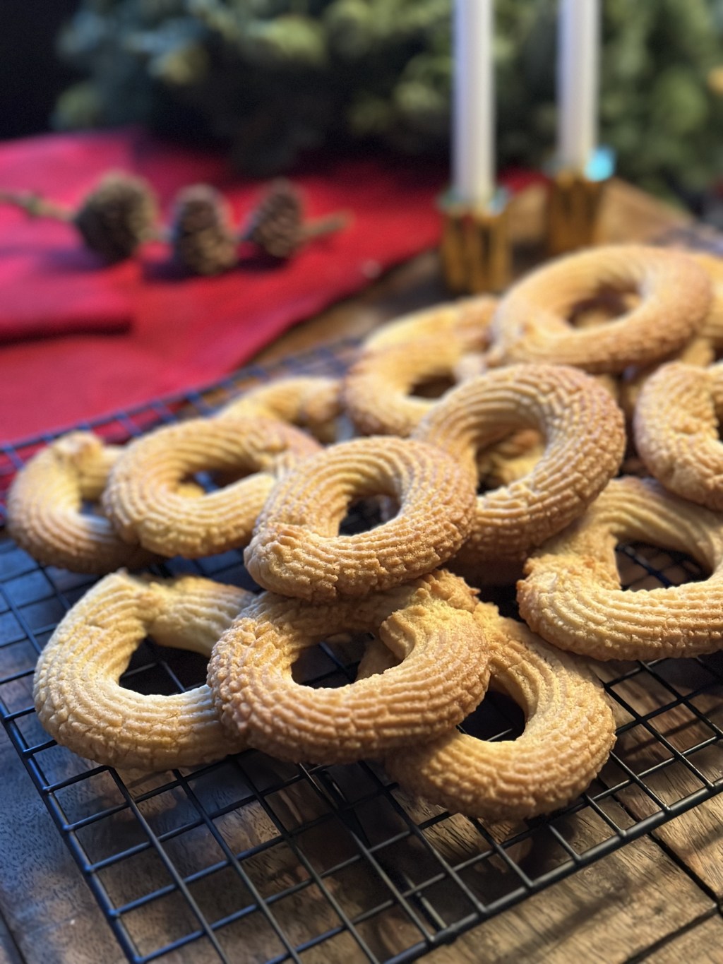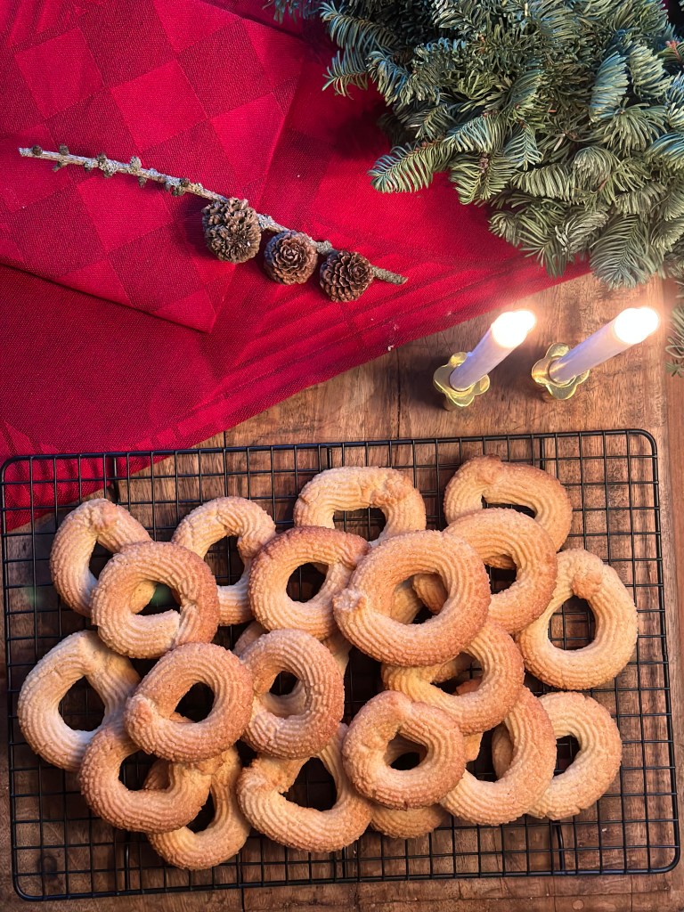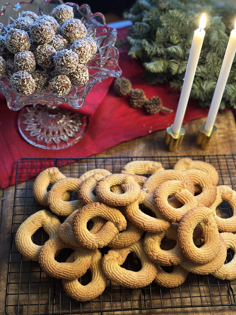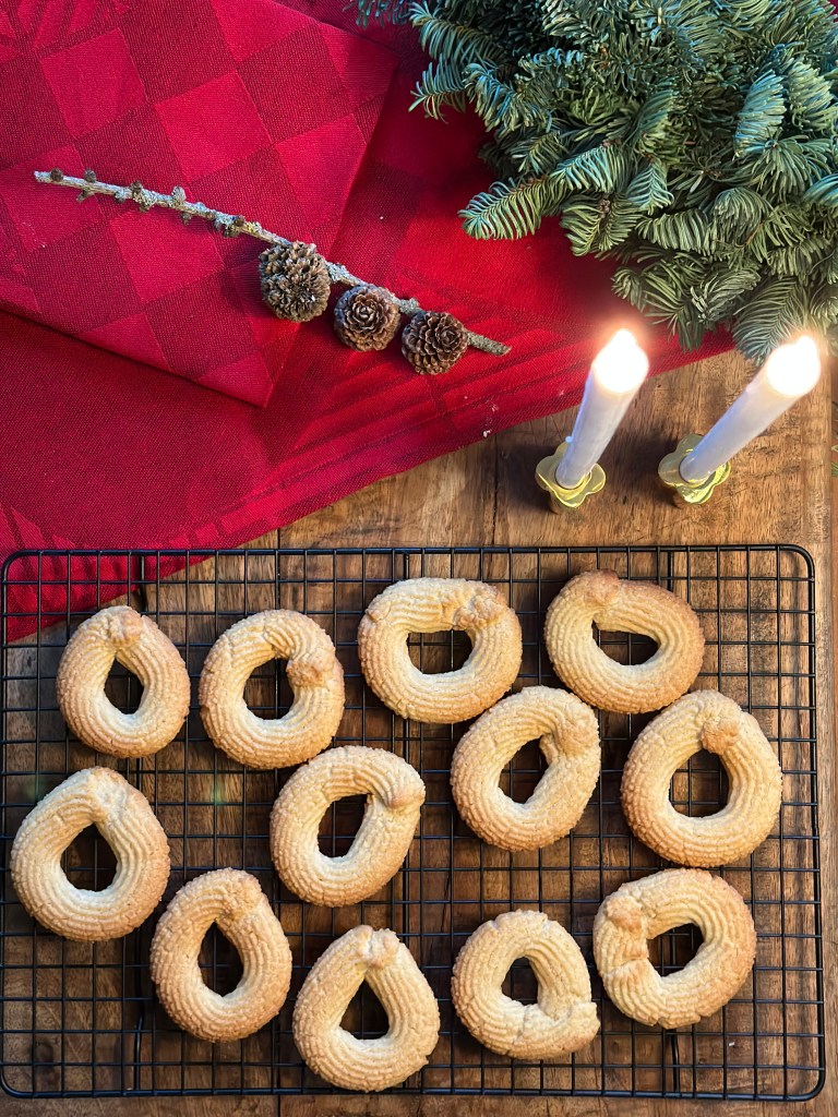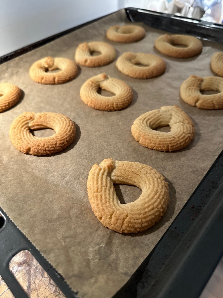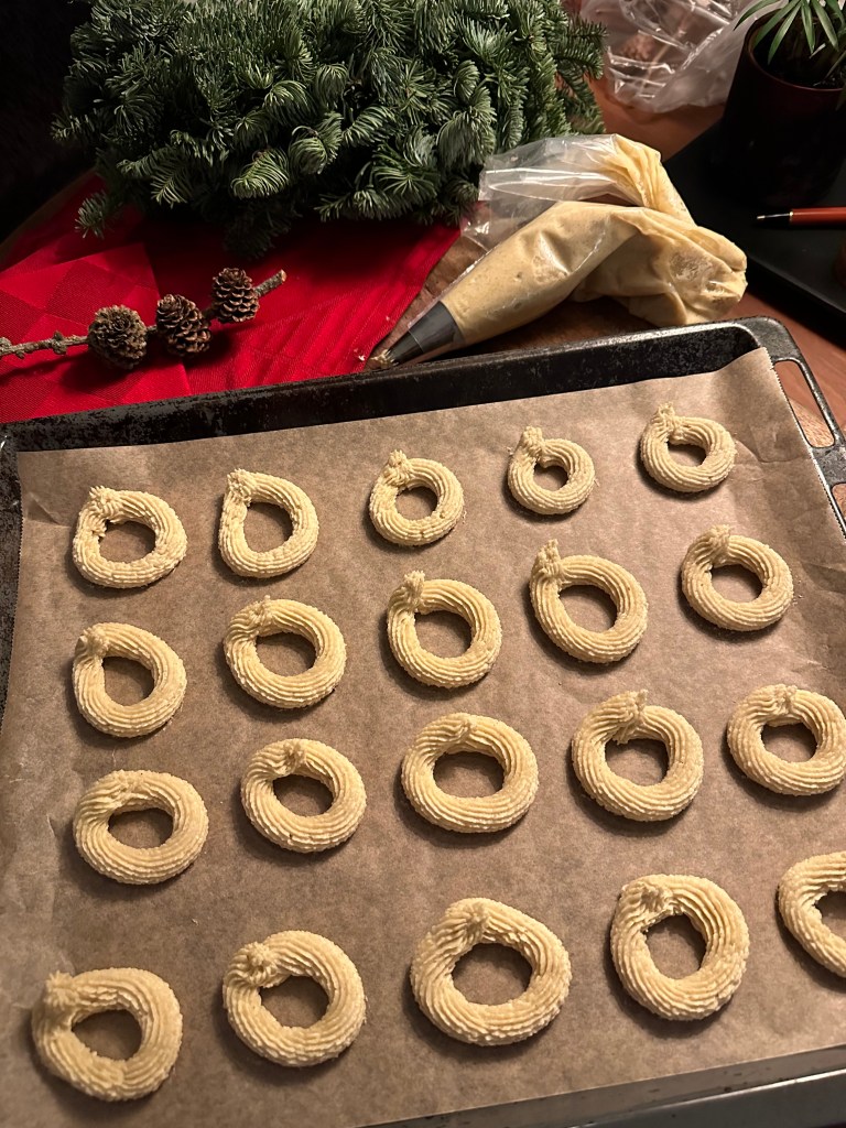 Det er faktisk lidt tricky med vaniljekranse, for de kan nemt splatte ud i ovnen. Denne opskrift har jeg selv lavet. De faldt sammen i første forsøg, men fik hjælp af Markus fra “den store bagedyst” med mængderne, og det viste sig jeg skulle have lidt mere mel i. Det gør den så også lidt sværere at presse ud gennem sprøjteposen, hvorfor tricket er, ikke at lægge for megen dej i posen af gangen.