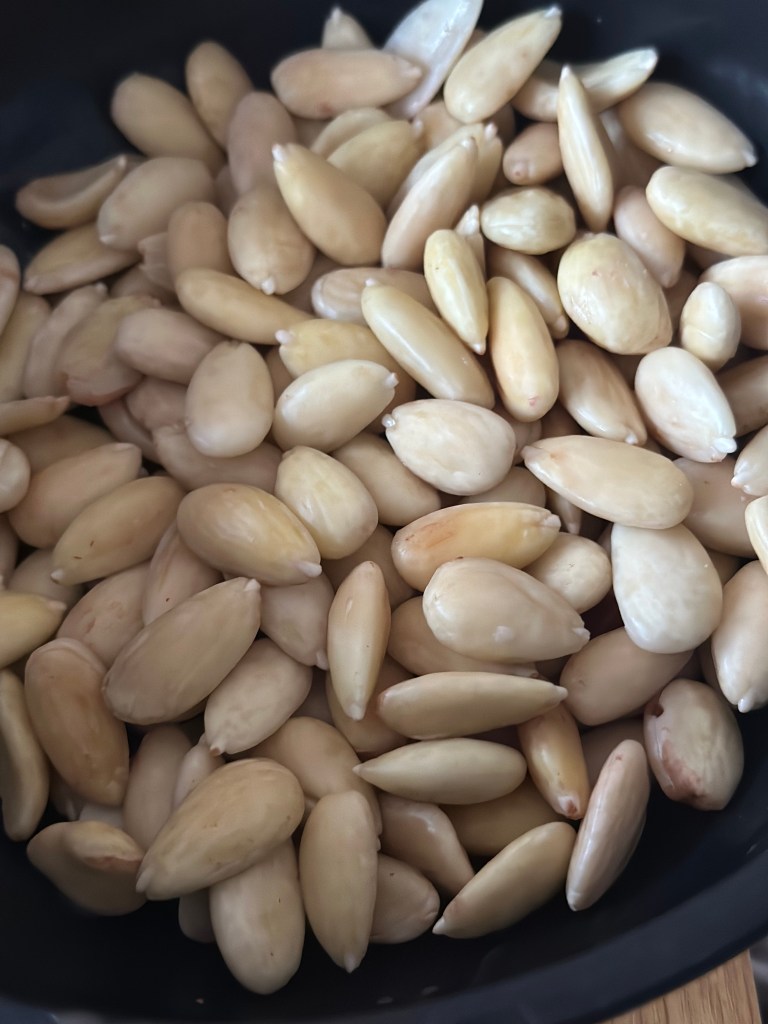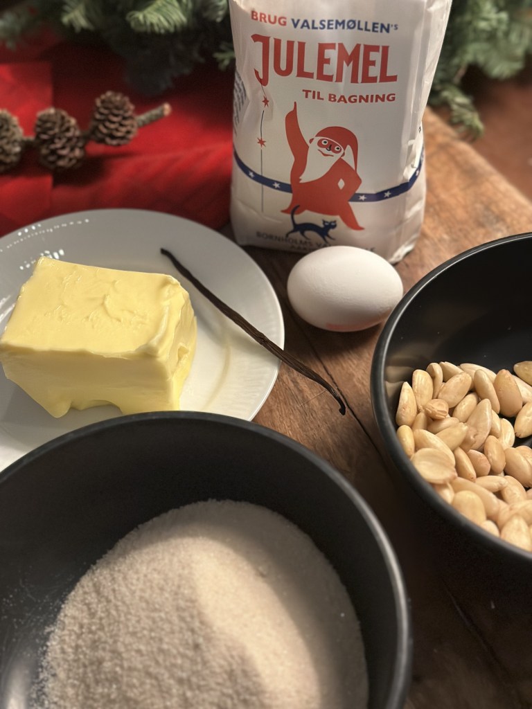 Mandlerne kommer i en foodprocesser, og males helt til mel. Smørret skal være blødt, men ikke flydende, og stadig koldt. Valniljestangen flækkes og kornene tages ud med en kniv. Bland kornene med lidt sukker, så er den nemmere at fordele i dejen. Alle ingredienserne skal blot i en røremaskine og bagefter – lidt efter lidt i sprøjteposen.