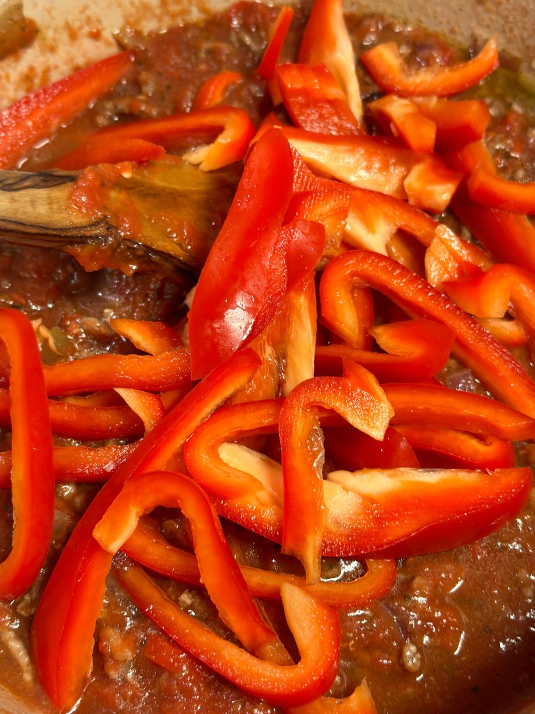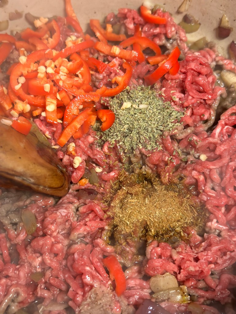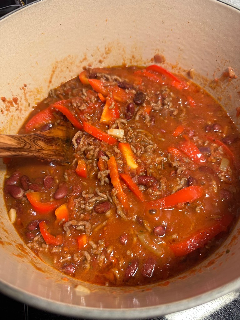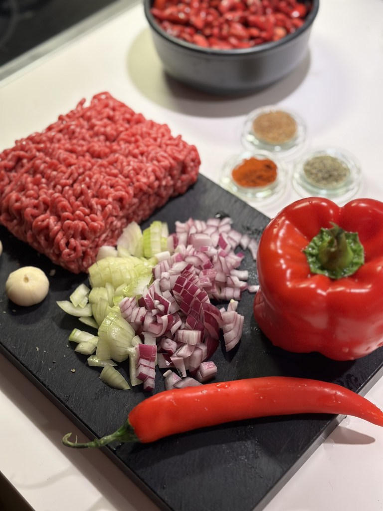 Hak løg og hvidløg. Smelt smøret i en gryde. Tilsæt løg og krydderier. Når løgene er “klaret” tilsættes oksekødet, og når det har fået farve, tilsættes resten af ingredienserne. Peberfrugten skærer jeg i strimler, men tern fungerer også. Med hakket oksekød, skal den blot simre i 30 minutter.