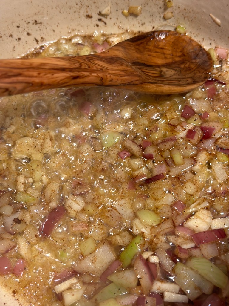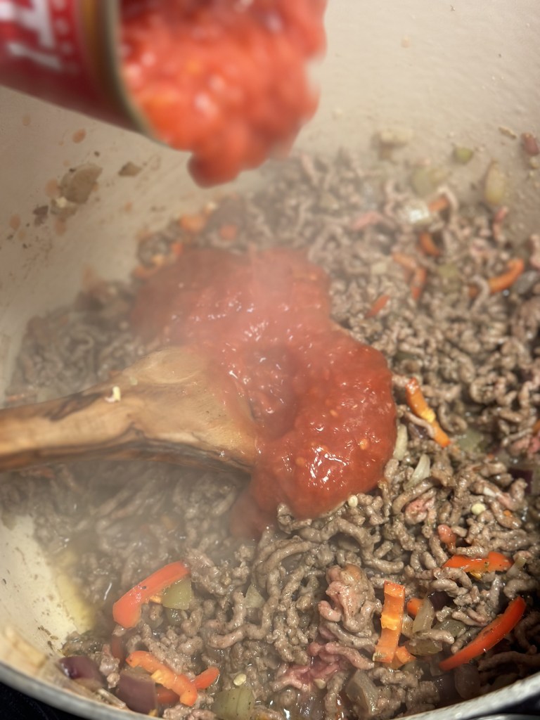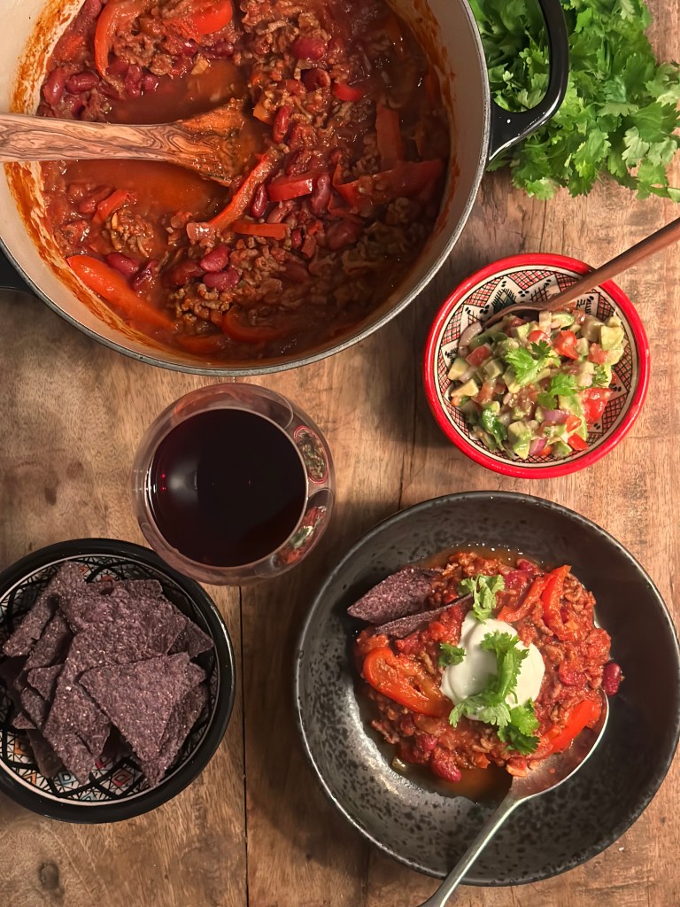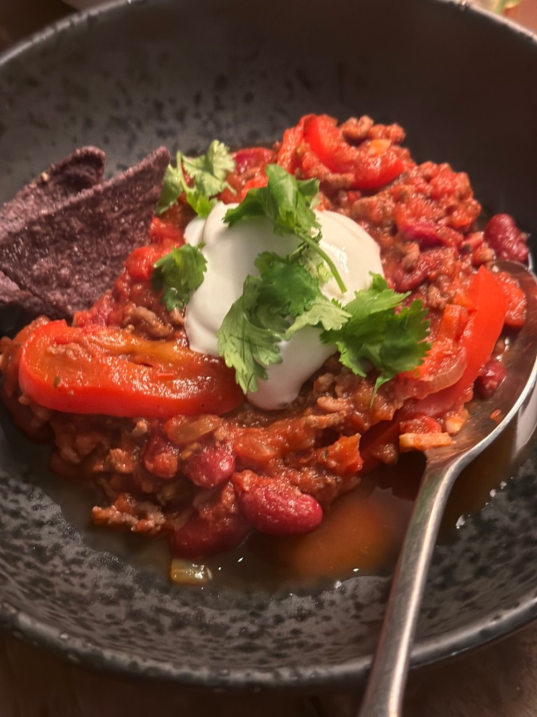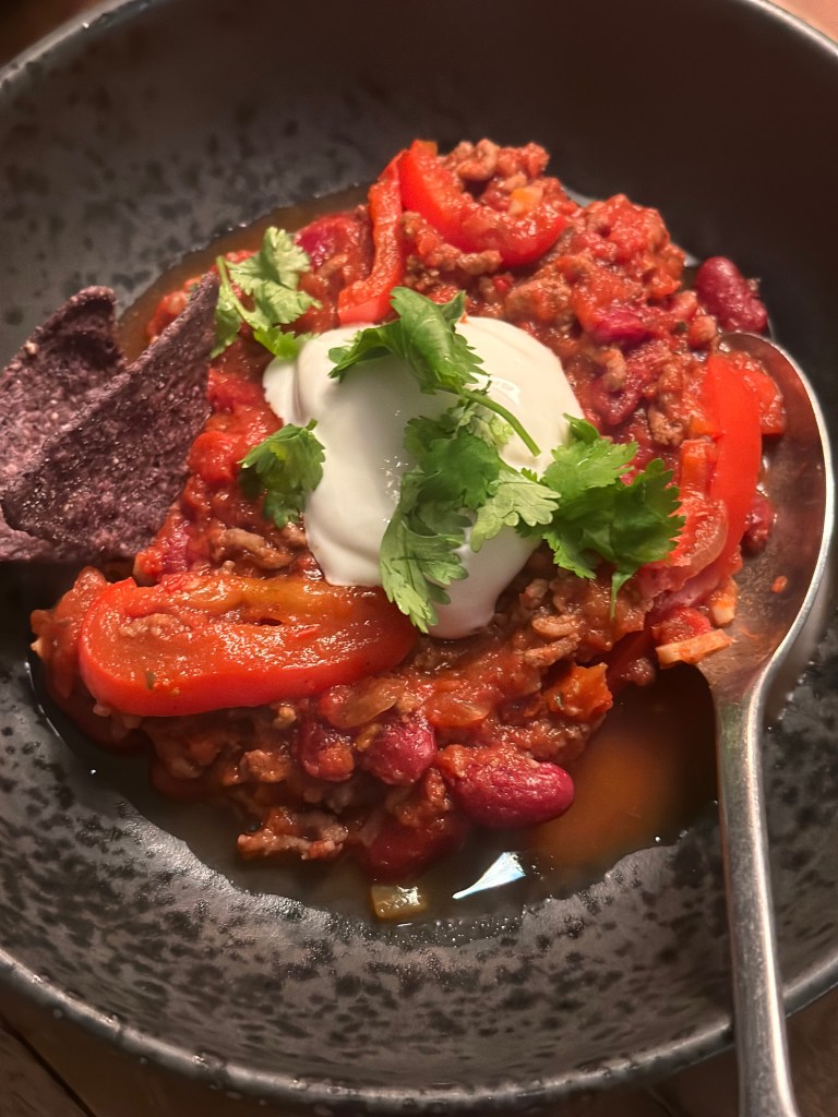 Hak løg og hvidløg. Smelt smøret i en gryde. Tilsæt løg og krydderier. Når løgene er “klaret” tilsættes oksekødet, og når det har fået farve, tilsættes resten af ingredienserne. Peberfrugten skærer jeg i strimler, men tern fungerer også. Med hakket oksekød, skal den blot simre i 30 minutter.