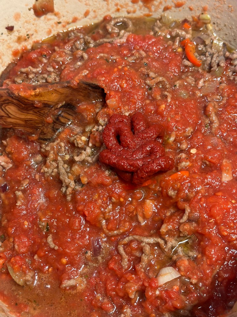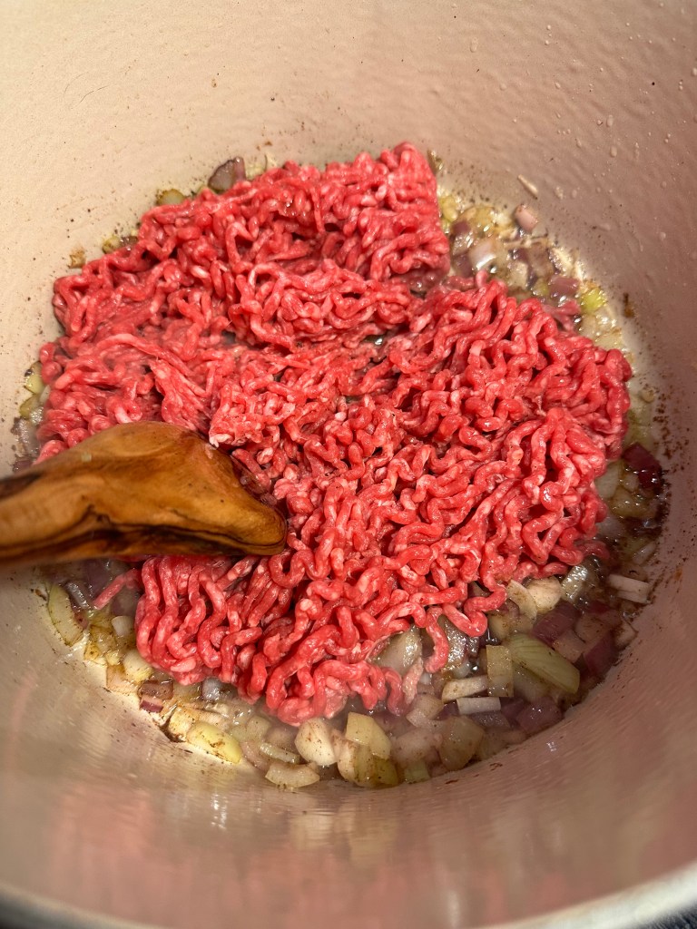 Jeg bruger hakket oksekød, den kan sagtens lave den med kødstrimler, og lade retten simre til de er helt møre. I en travl hverdag, er hakket oksekød, helt perfekt.
