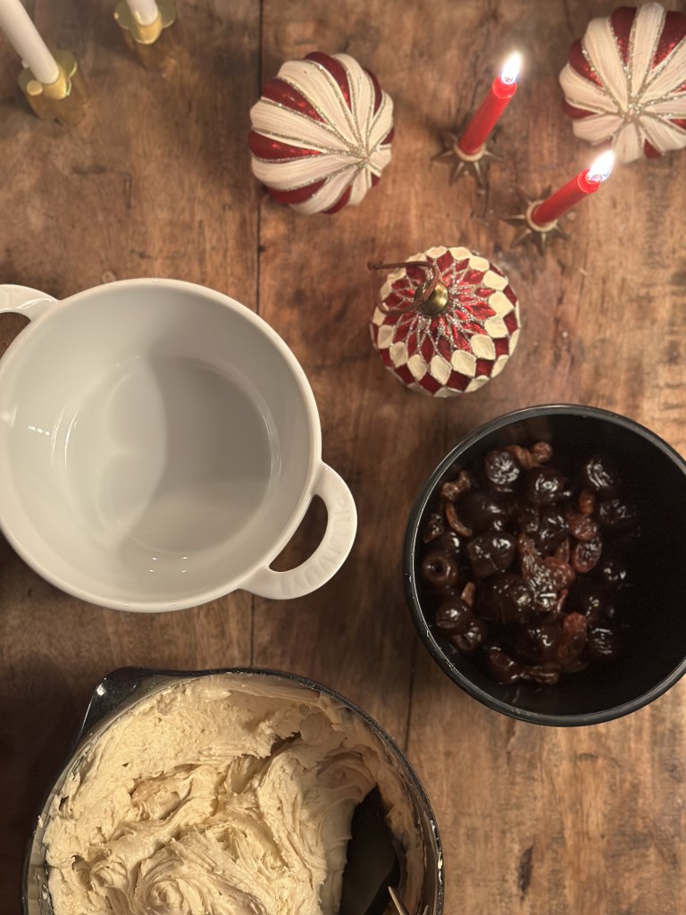 I sommers udstenede jeg en masse kirsebær, og lagde den på frost. Nogle af dem tager jeg op til denne kage. Lader dem tø op på køkkenbordet, hvor jeg også tager en håndfuld store rosines og lægger ved, så de bliver opblødt i saften fra kirsebærene.