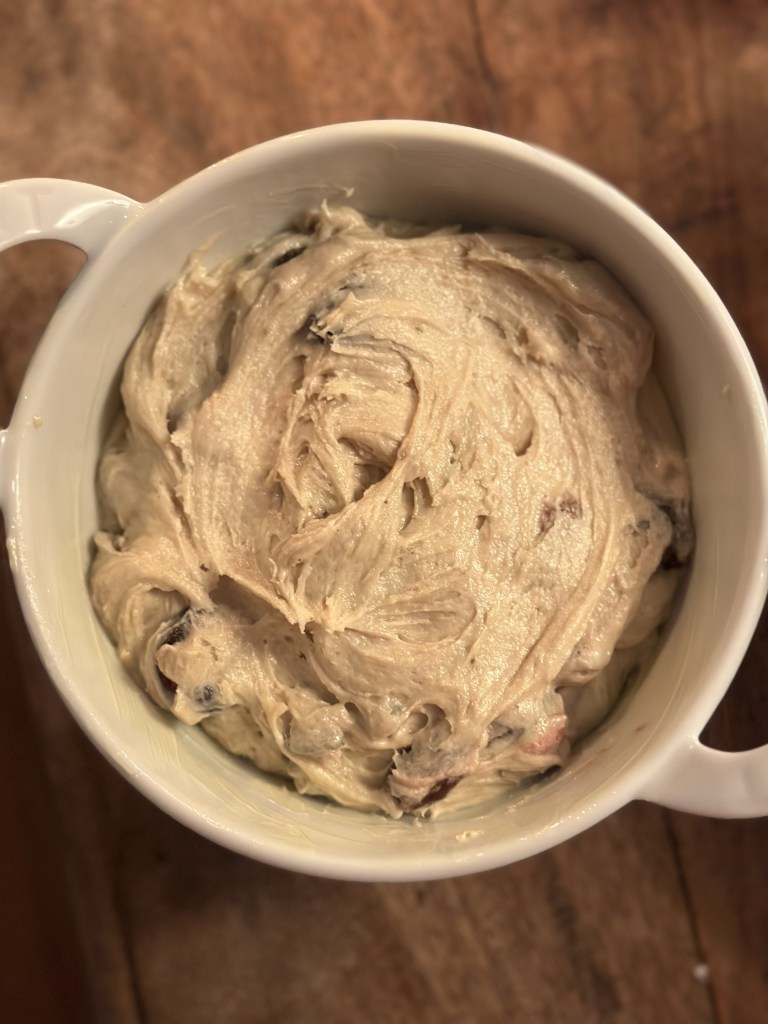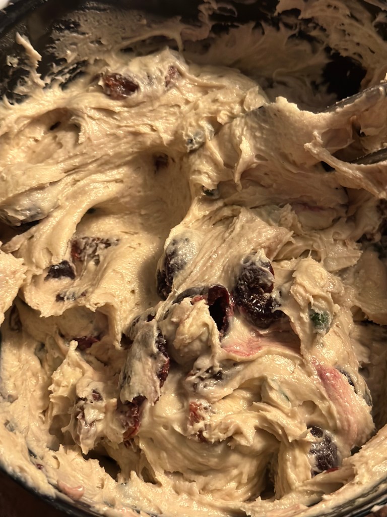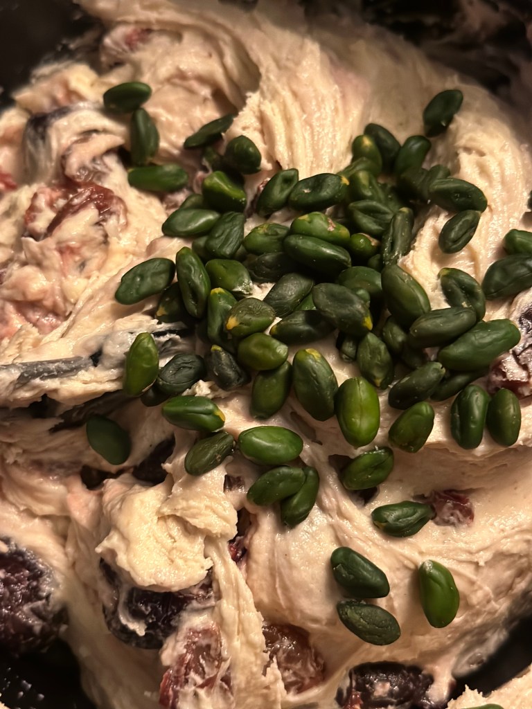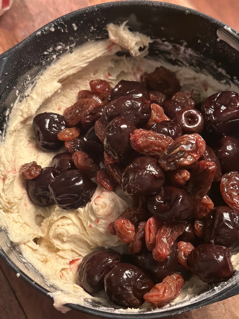 Jeg har brugt danske kirsebær fra i sommers, grønne pistacie nødder og store rosiner (som er bødgjort i saften fra kirsebærene.