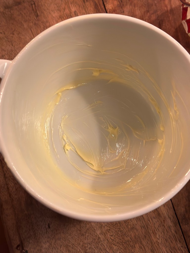 Kagedejen rørers sammen på dem måde at du først pisker sukker og smør – gøres nogle minutter. Tilsæt 1 æg af gangen og når de alle er rørt i, tilsætter du resten.