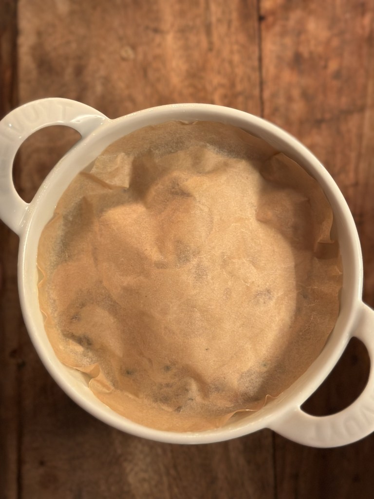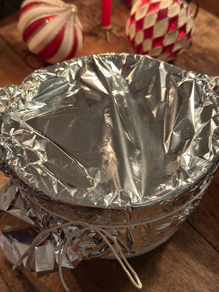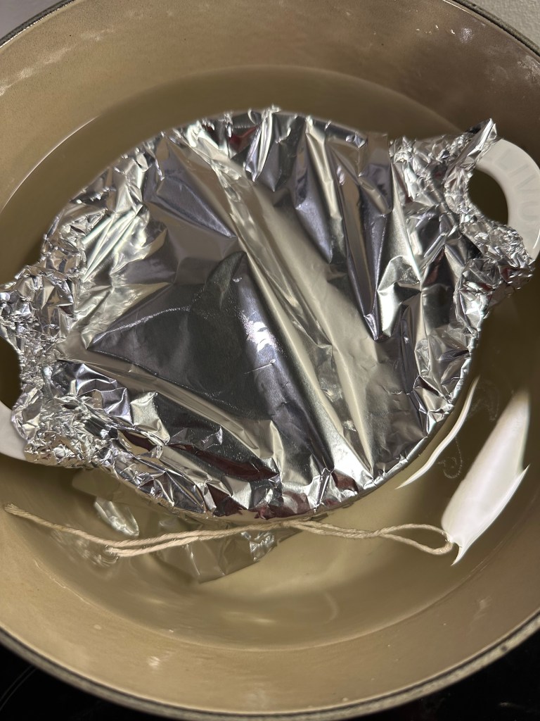 Du skal bruge en rund form eller varmefast skål som skal passe i en gryde, hvor du kan lave et vandbad (se billede). Monter dejen i formen – der skal være lidt plads til dejen kan hæve. Læg et stykke bagepapir oven på dejen (klip det til), og derefter 2 lag staniol, og bind en snor rundt om.