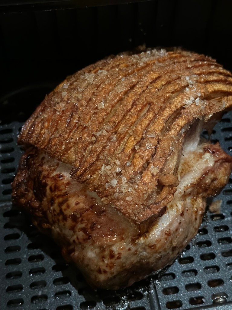 Jeg bruger et stykke kamsteg og i dag har jeg lavet den i en airfryer. Svær har fået kogende vand over, da de godt kan blive hårde i en airfryer. Godt med salt og ind i airfryeren med lidt vand i bunden.