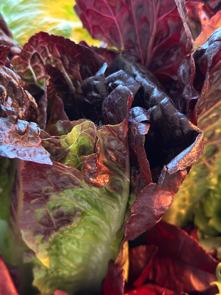 Romaine-salat, også kendt som romanosalat eller hjertesalat, er en type salat, der er kendt for sine lange, sprøde blade og en mild, let sød smag. Romaine-salat har lange, aflange blade, der samles i en tæt rosette i midten. Midterbladene er ofte mere lysegrønne, mens de ydre blade kan have en mørkere farve og en mere kraftig smag. Denne på billedet er en rødlig variant.