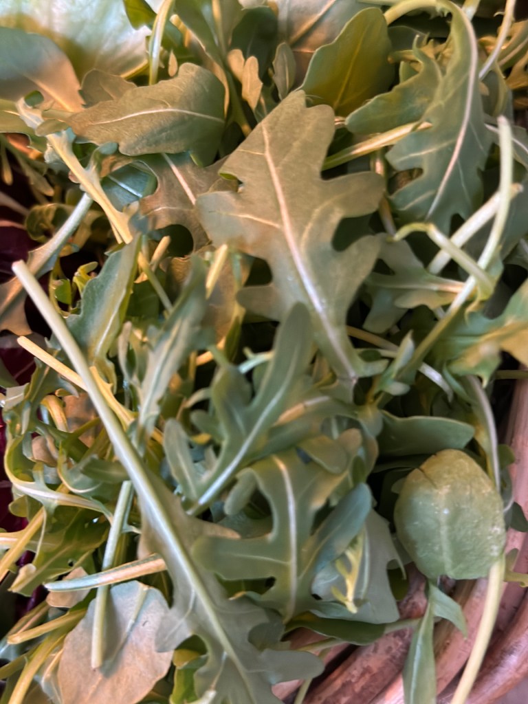 Rucola, også kendt som arugula eller roquette. Rucola er en bladgrøntsag, der er kendt for sin karakteristiske, peberagtige smag. Rucola har lange, spinkle blade med dybt indskårne kanter. Bladene er normalt mørkegrønne og kan variere i form og størrelse.