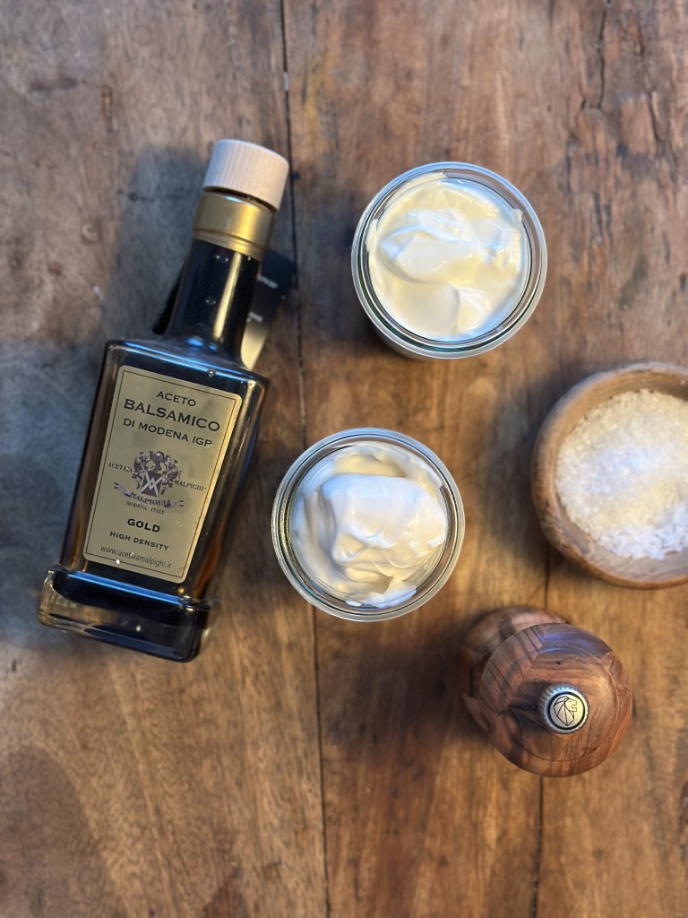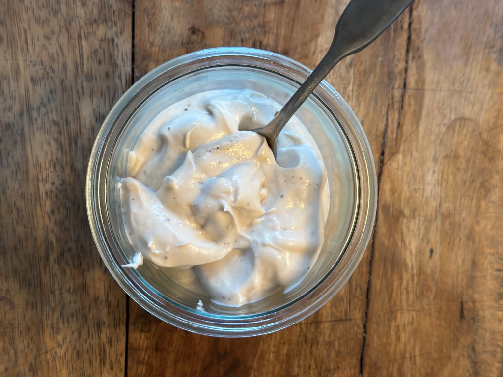 Dressing passeret på 2 spsk mayonnaise og 2 spsk yoghurt passer perfekt til denne portion, da salaten på ingen måde må “bade” i dressing.