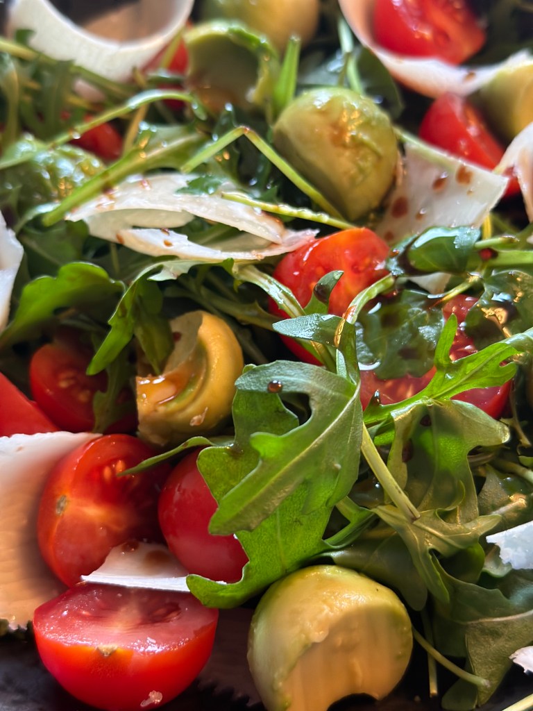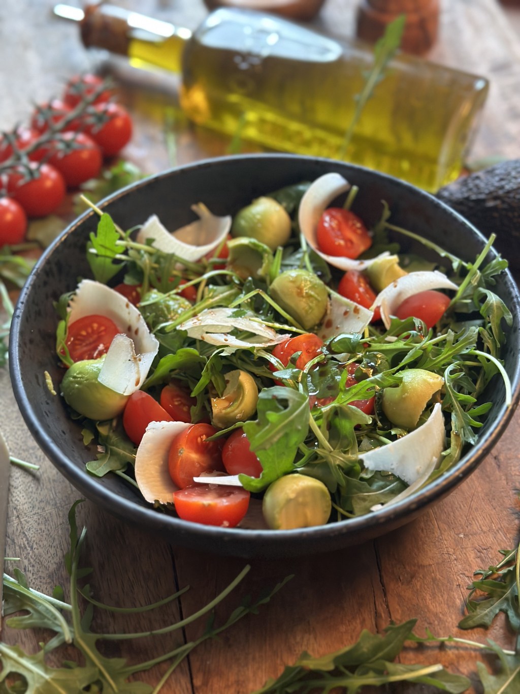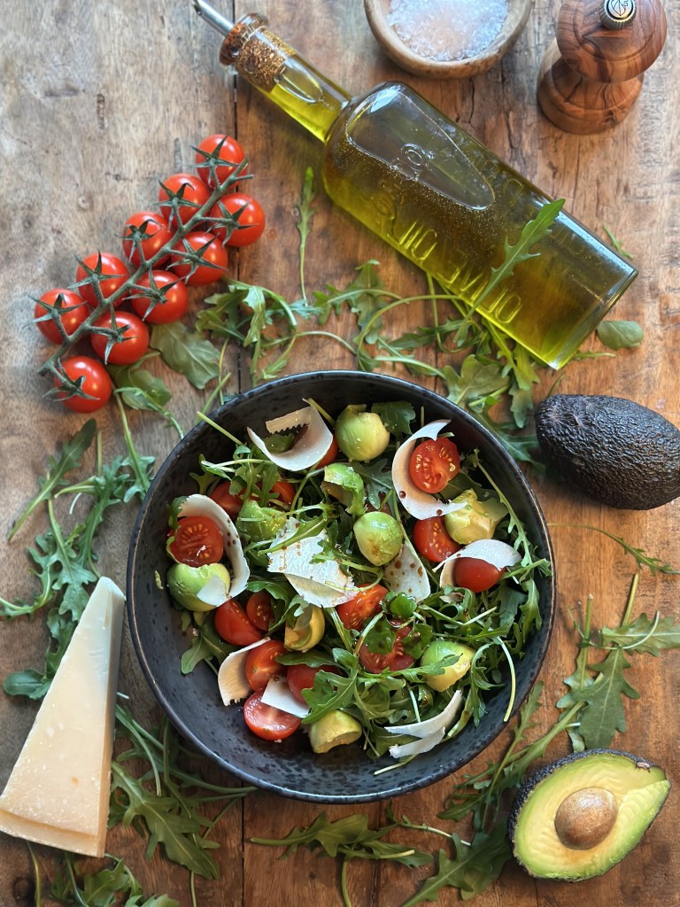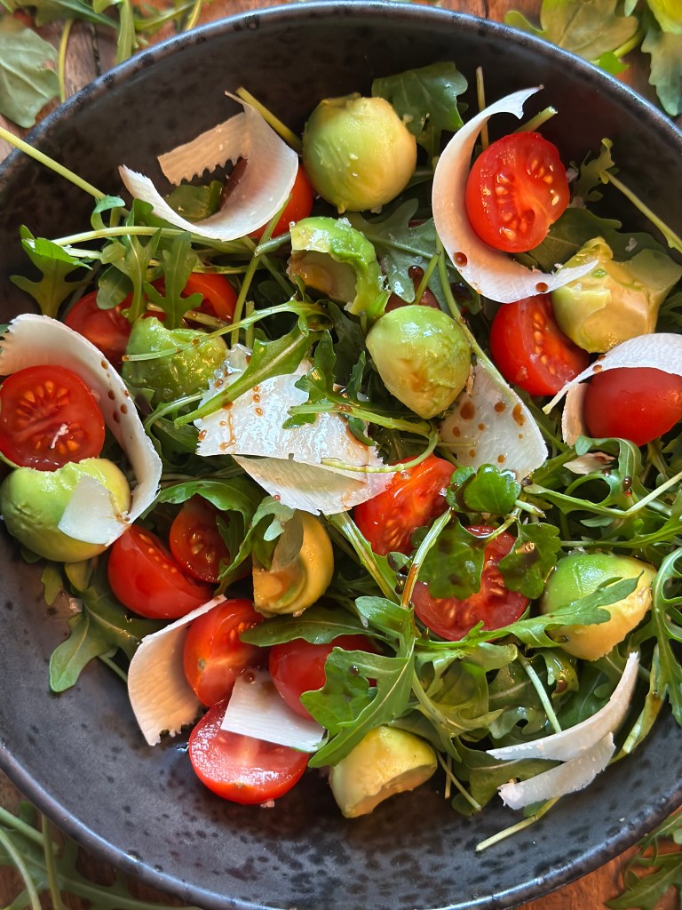 Her laver jeg min egen yndlings salat. Jeg kan ikke huske hvor jeg fik den første gang, men den har fulgt mig igennem mange år. Det er balancen imellem den bitre rucola som vel er den mest italienske af dem alle, de søde tomater med masser af umami. Parmesan som er umami og proteiner. Og endelig avocadoen som med sin cremet sunde fedme runder salaten fint af. Olivenolie og balsamico er eneste dressing. Og så smagt til med lidt flagesalt.