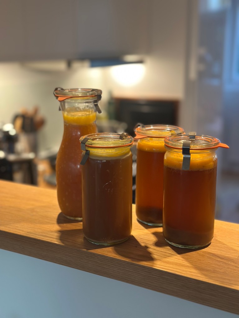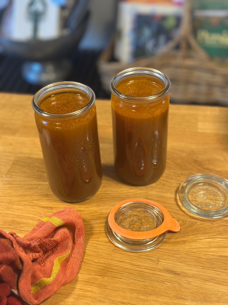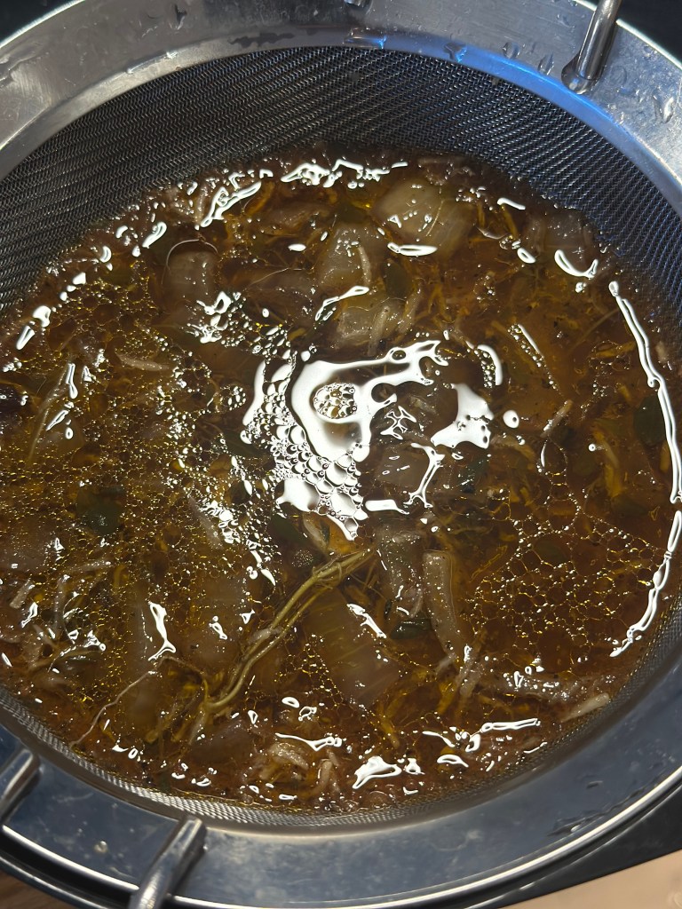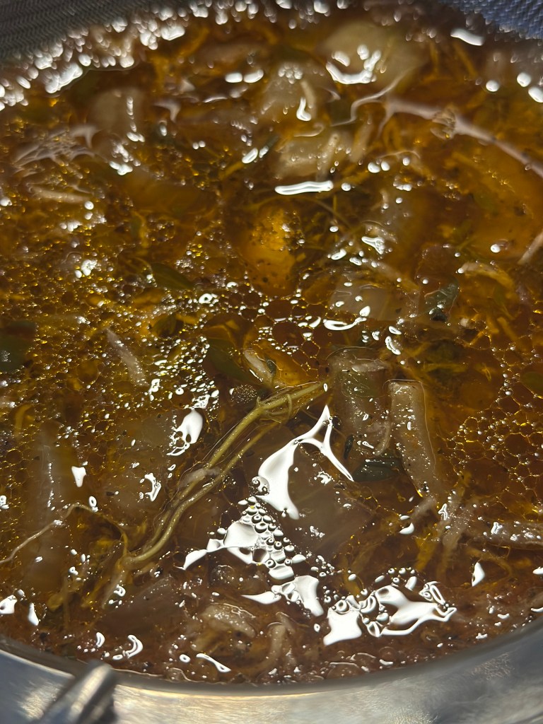 Brun løg i smør og kom stegen heri. Når den er brunet på alle siden, tilsættes vand og de øvrige grøntsager. Tilsæt krydderurterne. Lad det hele simre i 2-3 timer tid, og lad det gerne stå lidt. Si grøntsagerne fra, hæld på glas og sæt på køl. Jeg bruger 3 dl glas.