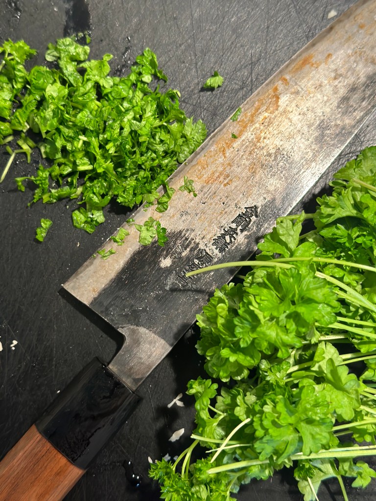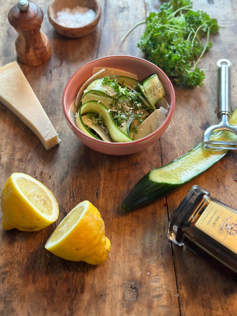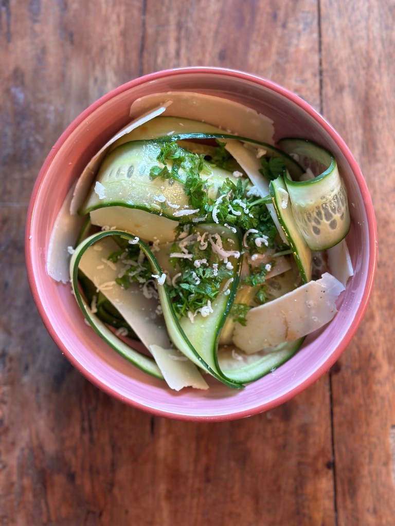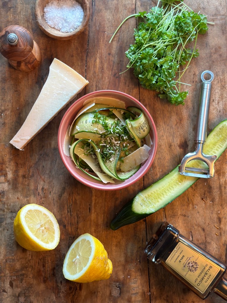 Jeg river agurken på langs med en kartoffelskræller, og gør det ligeledes med parmesanen. Jeg presser citronen, og smager den til med balsamico – start med 1,5 spsk og resten, hvis du synes. Smag til med salt og peber – glem ikke peber.. Pynt med hakket bredbladet persille og fintrevet parmesan.