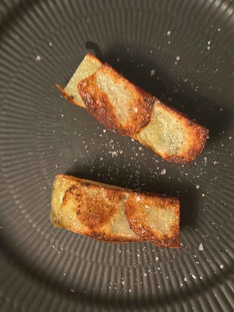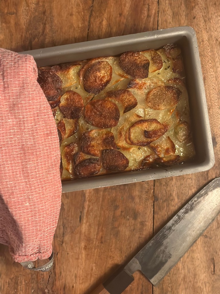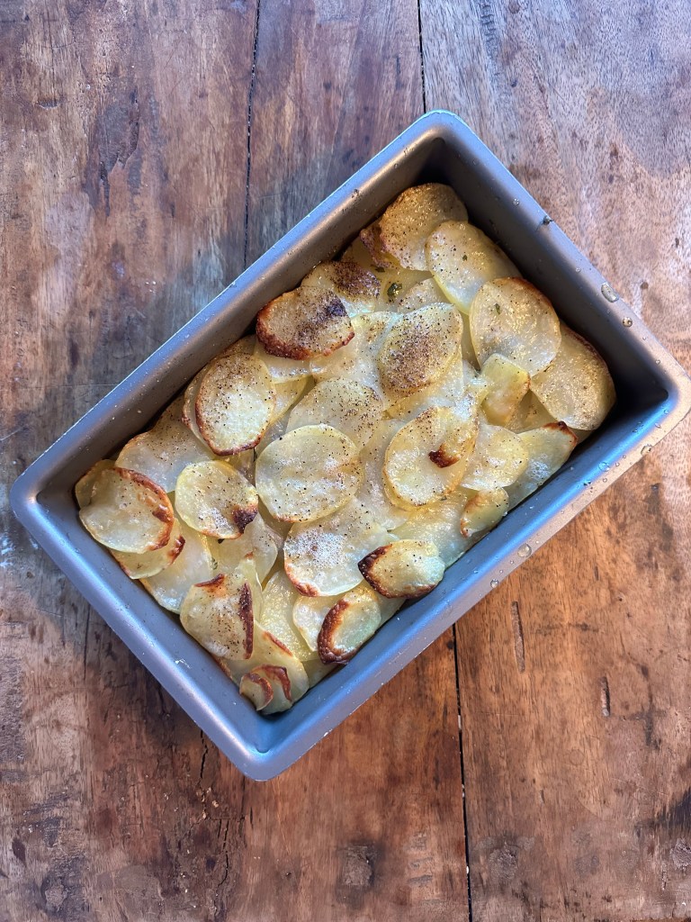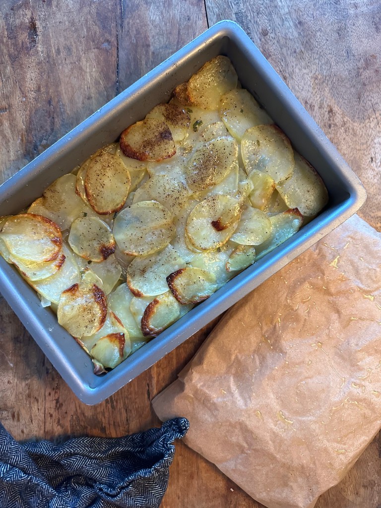 Jeg laver min version i 2 dele. Først bruger jeg et mandolinjern til at skære kartoflerne i tynde skiver. Herefter lægger jeg den i lag i en lille bradepande, hvor jeg pensler med smør imellem alle lagene. Jeg tilfører rosmarin, salt og peber ved hvert andet lag. Jeg kommer herefter bradepanden i ovnen i 40 minutter ved 200 grader.