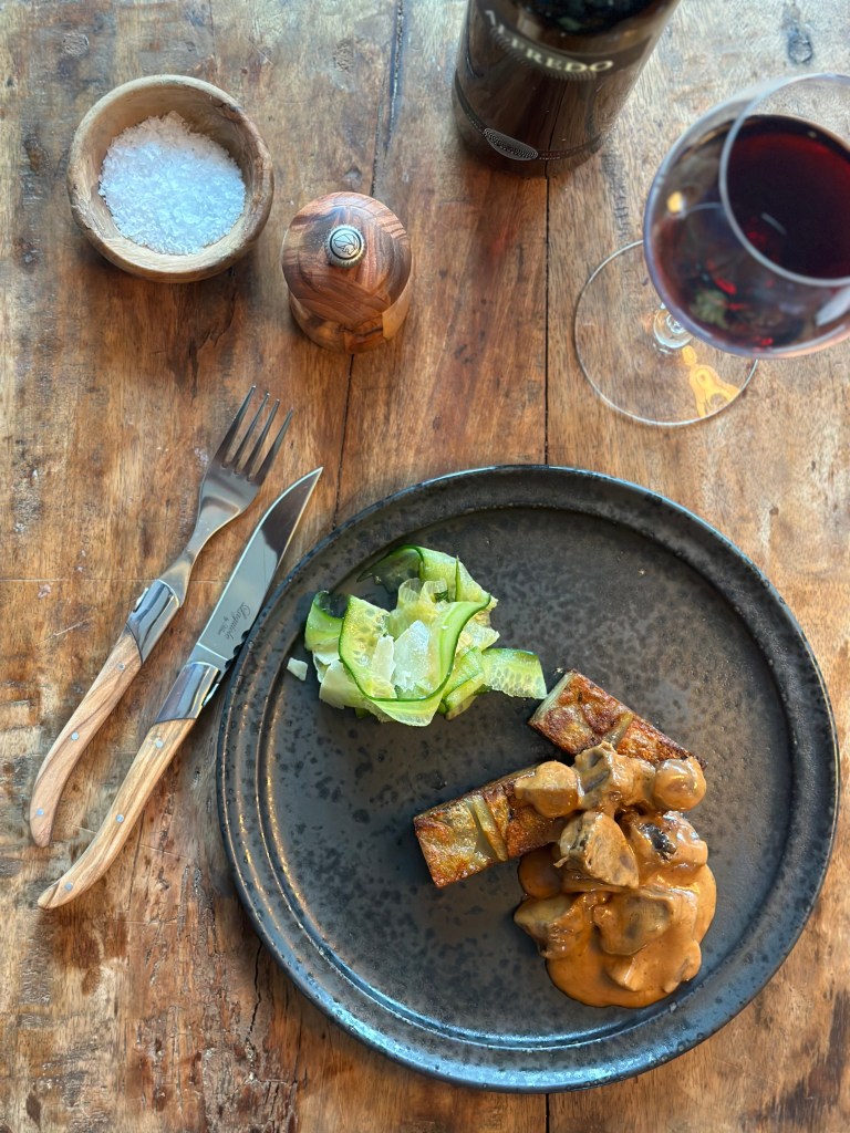 Jeg lavede Pommes Anna til, og fordi de havde rosmarin i, så forvirrede jeg ikke retten med krydderurter i saucen. Se opskriften her !