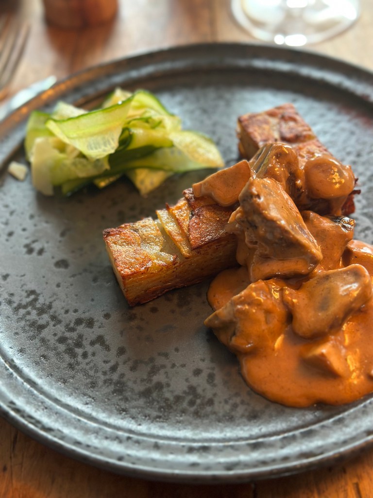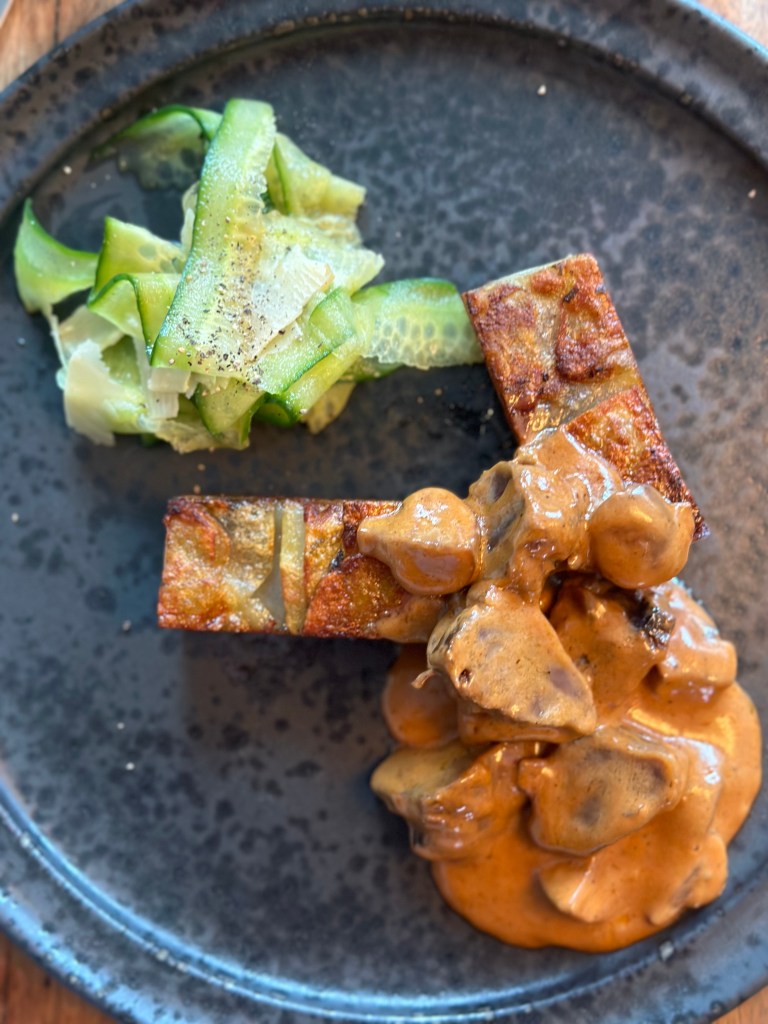 Endelig en tvistet version af en agurksalat. Dressingen var citron og balsamico – det sure med den søde lidt eddike, og så et tvist med revet parmesan… Spændende kombination som kan bruges flere steder – men her gav friskhed og modspil til den ellers lidt fede ret. Se opskriften her !