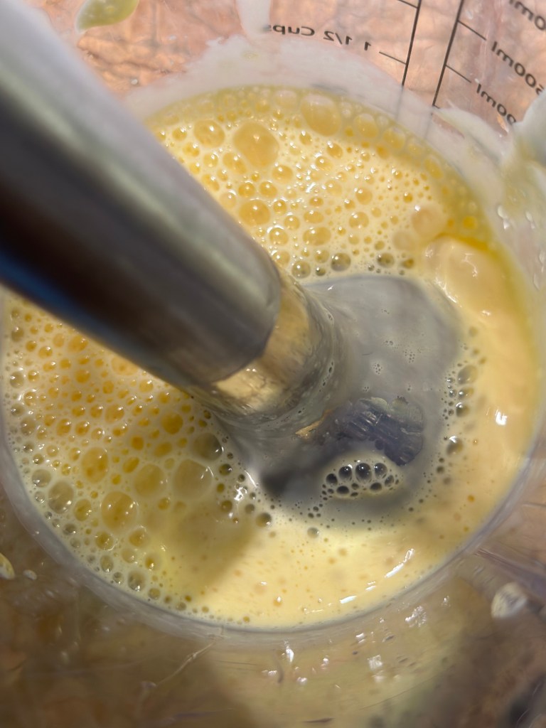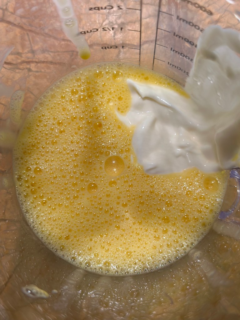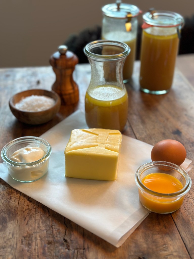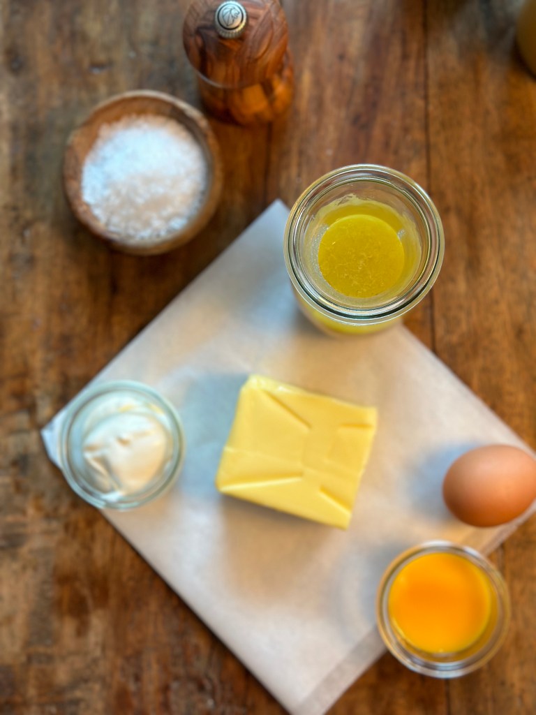 Æggeblommer, æg og creme fraiche blendes med en stavblender. Smelt smørret ved svag varme og tilsæt fond. Varm op til ca. 60 grader. Tilsæt i en tynd stråle – lidt af gangen, mens du blender. Når det hele er blandet sammen, hældes saucen tilbage i gryden, smag til med salt og peber. Når du varmer den op, bliver den tykkere, og det er vigtigt du gør det langsomt. Smag eventuelt til med lidt citronsaft.