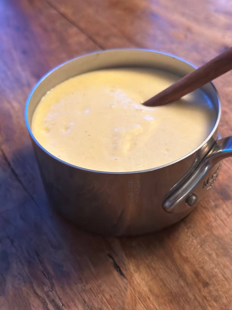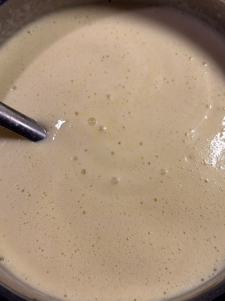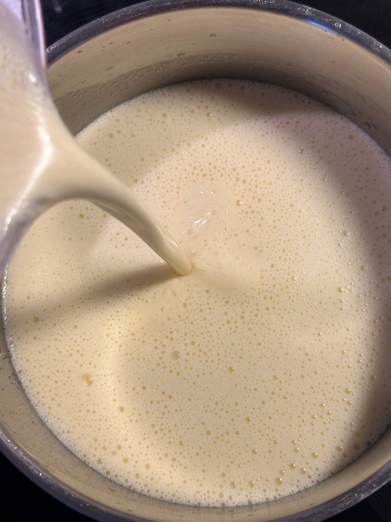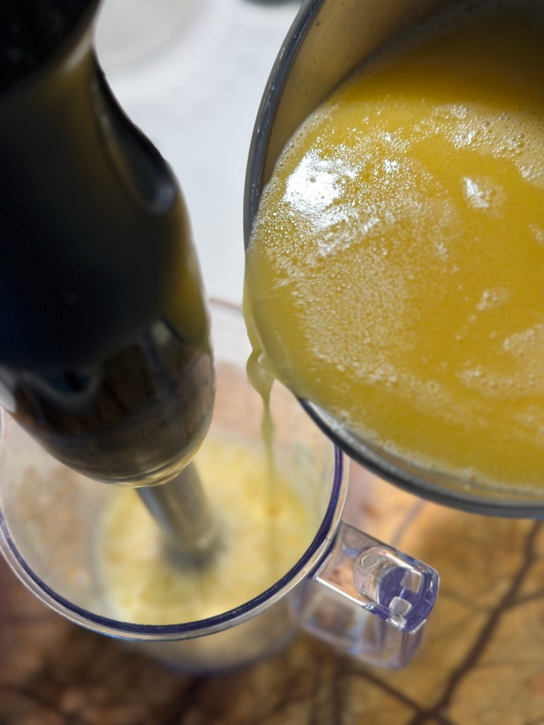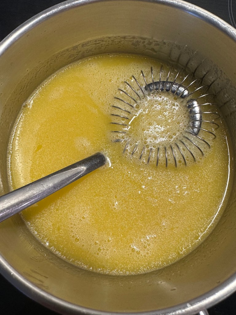 Æggeblommer, æg og creme fraiche blendes med en stavblender. Smelt smørret ved svag varme og tilsæt fond. Varm op til ca. 60 grader. Tilsæt i en tynd stråle – lidt af gangen, mens du blender. Når det hele er blandet sammen, hældes saucen tilbage i gryden, smag til med salt og peber. Når du varmer den op, bliver den tykkere, og det er vigtigt du gør det langsomt. Smag eventuelt til med lidt citronsaft.