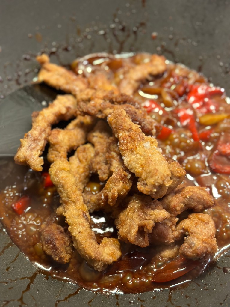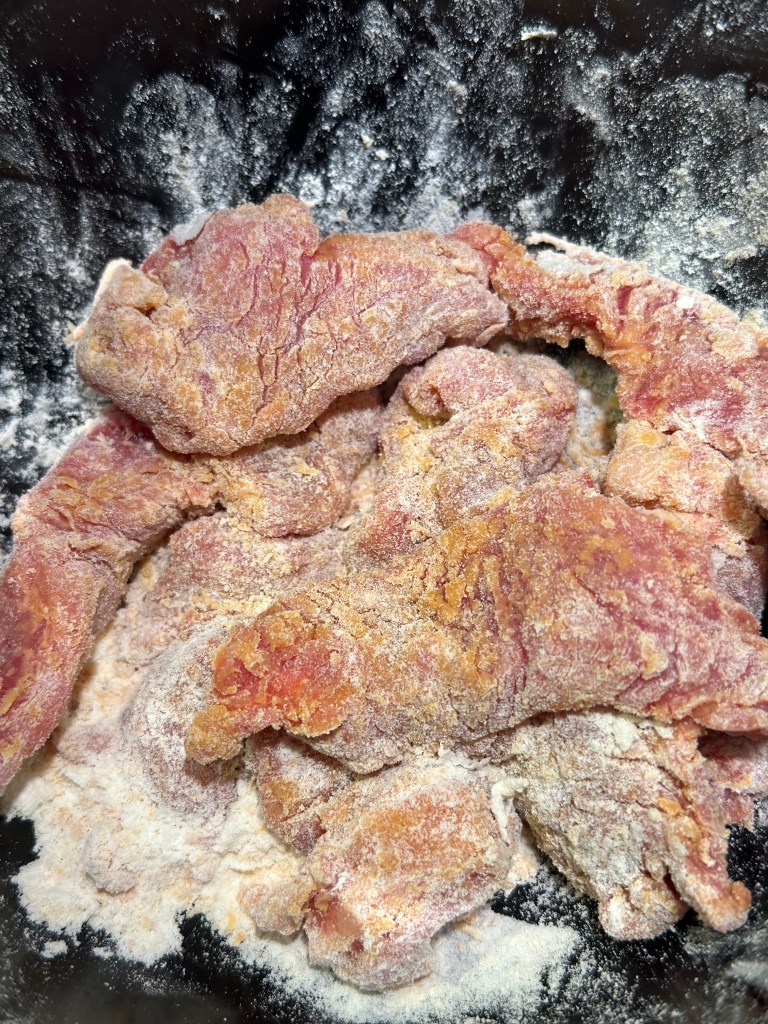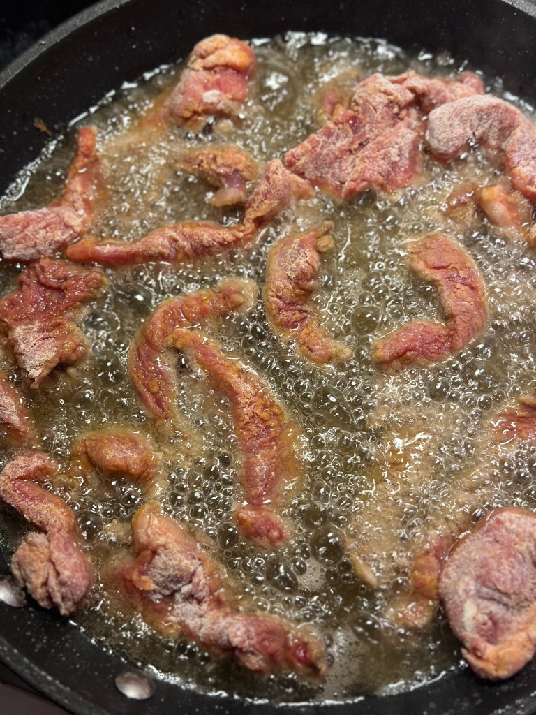 Jeg bruger ripeye, så er man altid sikker på det er mørt. Skærer i ikke for store stykker, og vender det i mel, salt og peber. Steger det ved høj varme i risolie, da den er fyldt med antioxidanter, smager godt og kan tåle høj varme. Bedste varme til fritering er 160-170 grader, men helst ikke over, da kulhydrater dermed fremkalder akrylamid, som er sundhedsskadelig.