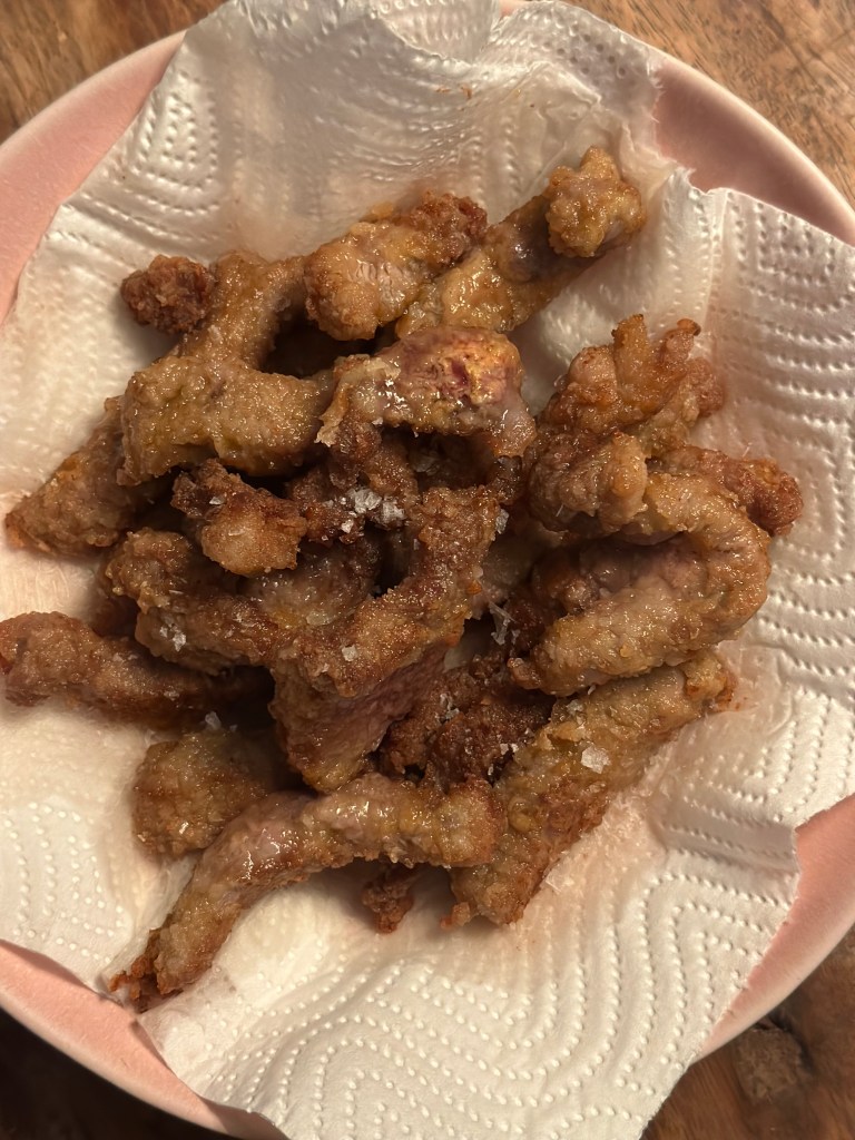Jeg tager det op på et stykke papir og hælder olien fra – lader lidt være tilbage. Saucen laver jeg af: