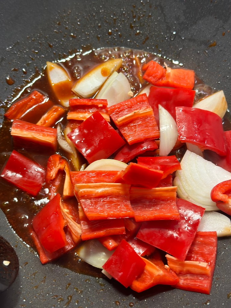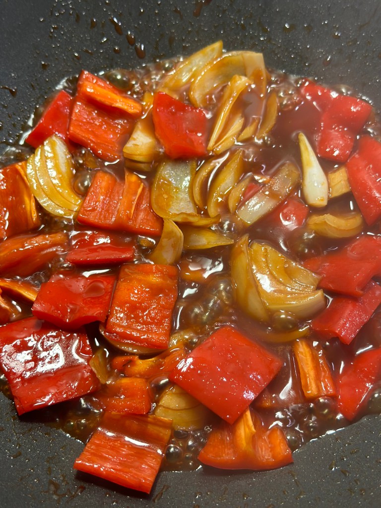 I mundrette størrelsen. Du vil opleve det er en meget intens smag nu, og derfor jævner jeg med 1 dl piskefløde shaket med 1 spsk hvedemel. Laver den sidste tilsmagning, og herefter vender jeg kødet i. Løg og peberfrugt skal være tilberedt, men med bid i.