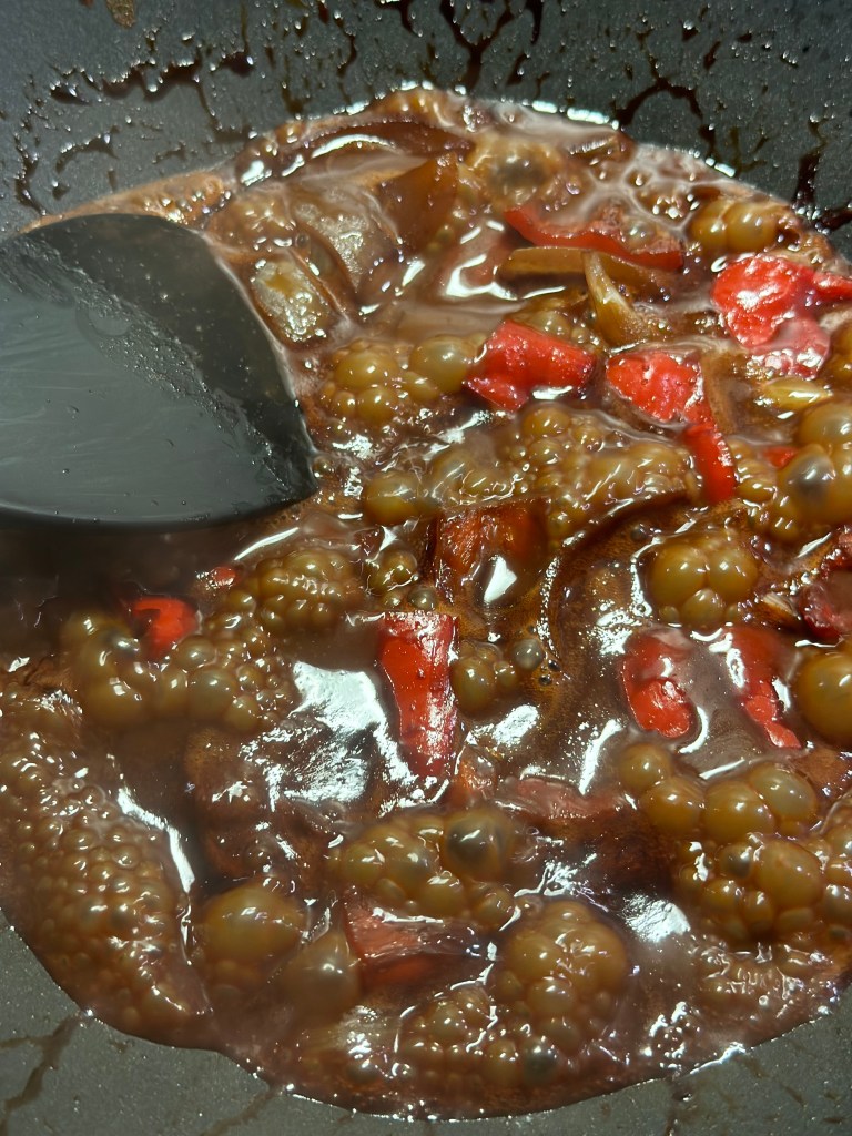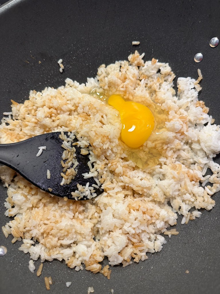 Serverer denne gang med fried rice, som blot er stegte ris i risolie, tilsat 1 æg… Jeg har brugt jasminris.
