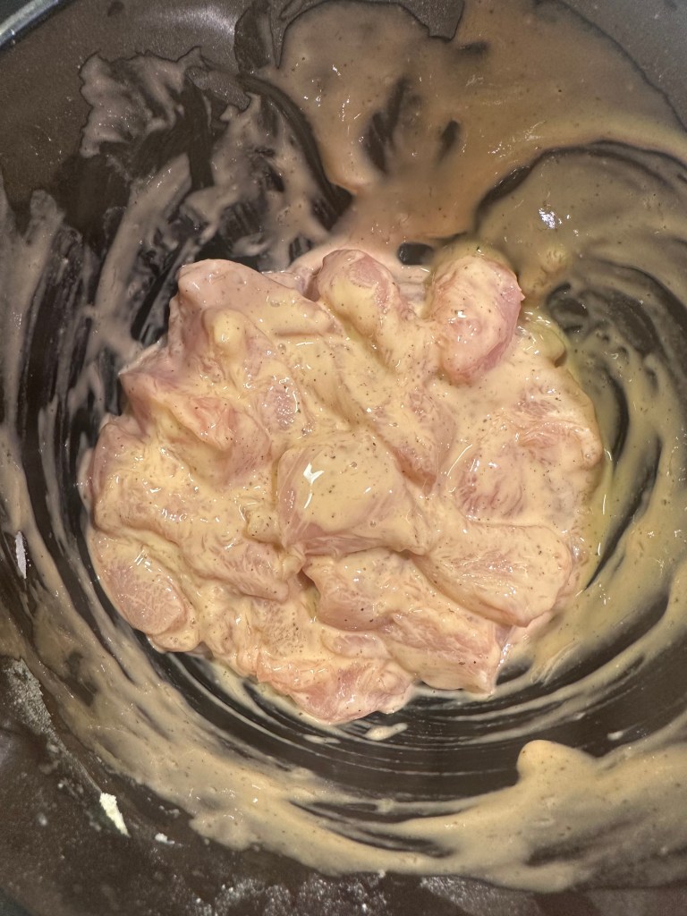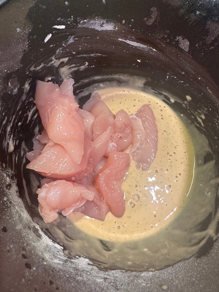 Jeg skærer kyllingen i små stykker. Resten af ingredienserne pisker jeg sammen og tilpasser med mel, således dejen er en lidt tykkere pandekagedej.