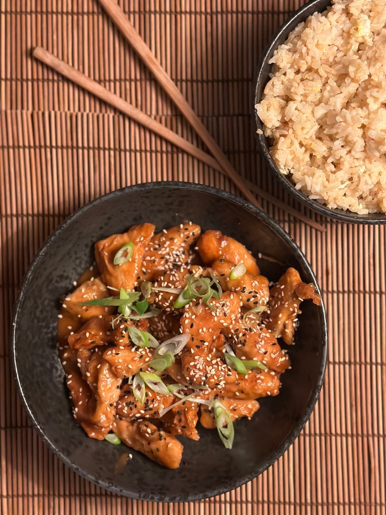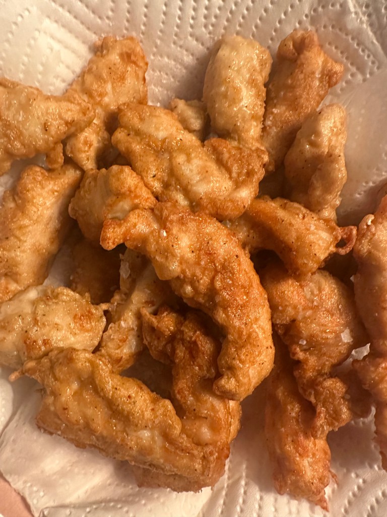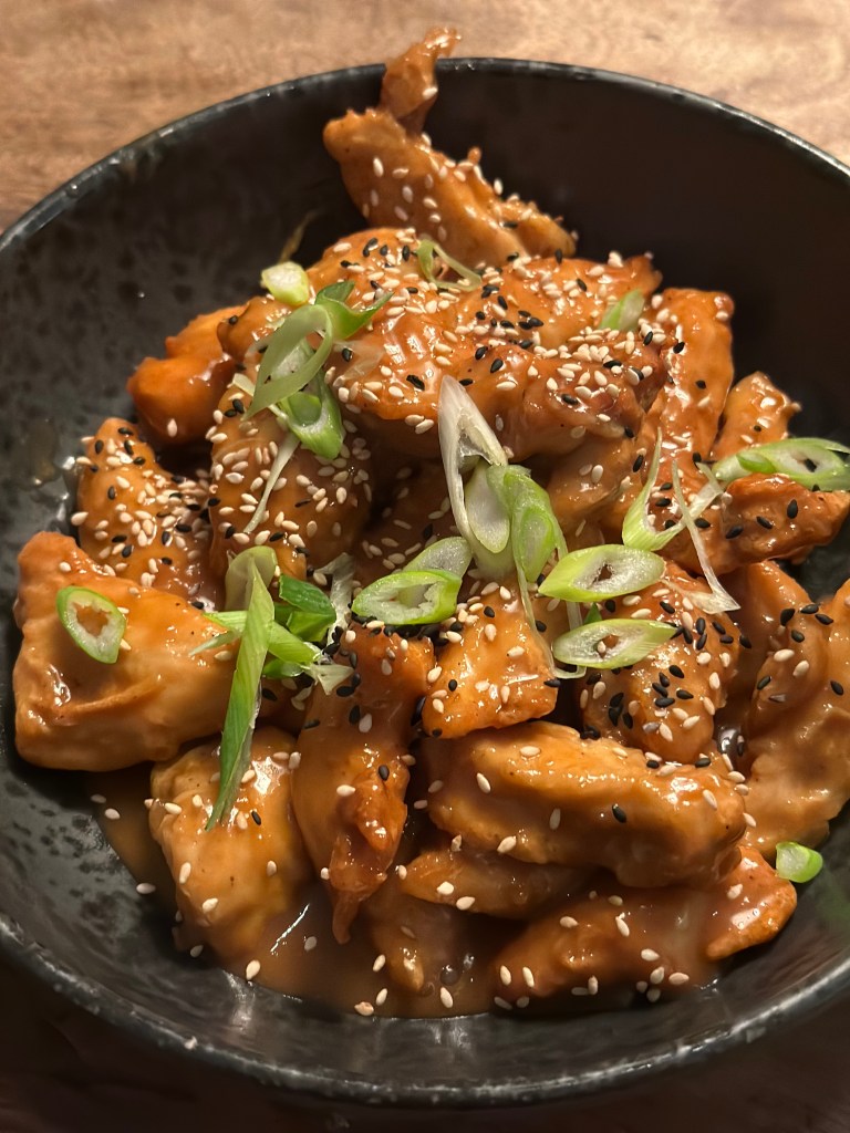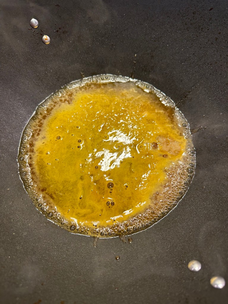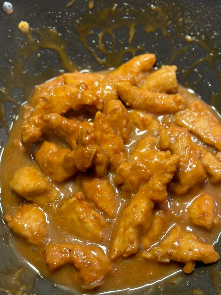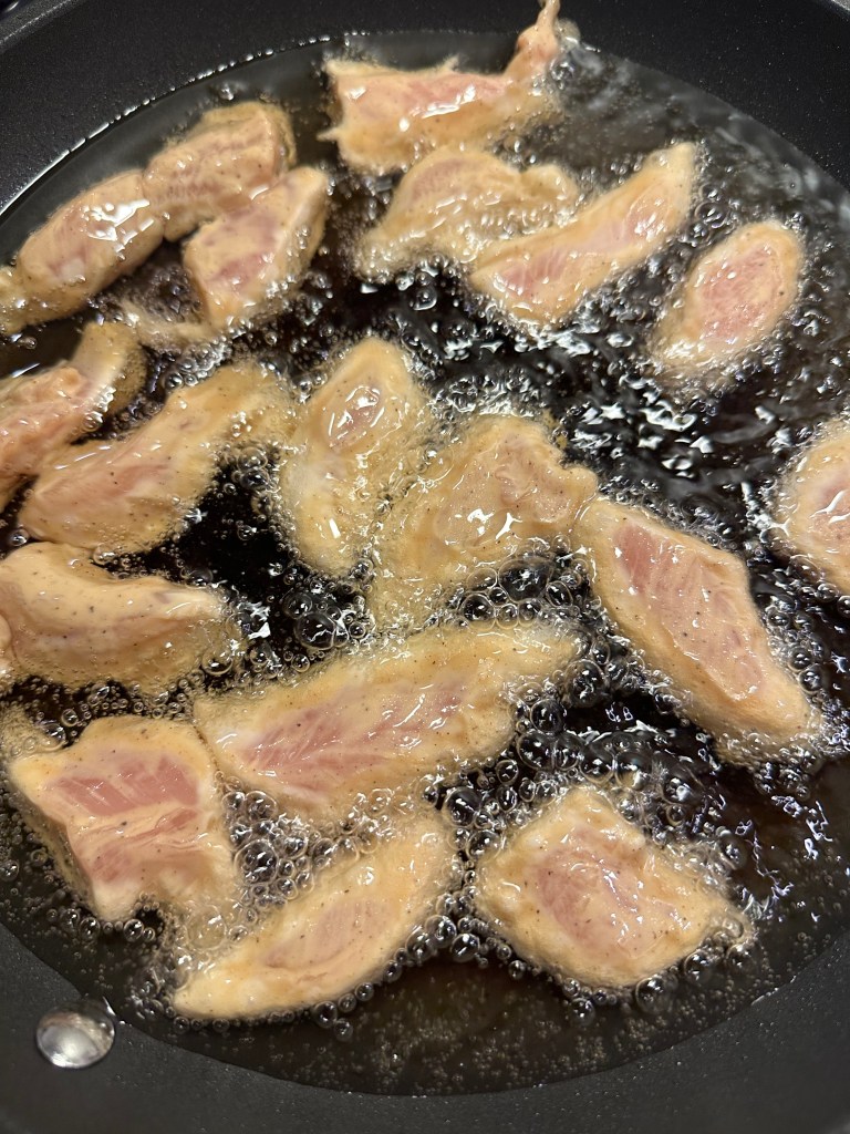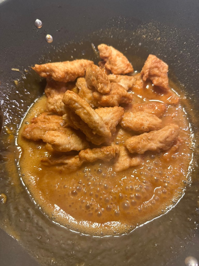 Jeg vender kyllingen i, og friterer i Risolie, da den smager godt og kan tåle høj varme. Bedste varme til fritering er 160-170 grader, men helst ikke over, da kulhydrater dermed fremkalder akrylamid, som er sundhedsskadelig. Kyllingen skal bare være gyldne og lægges på papir og drysser med flagesalt. Jeg fjerner olien, og tilsætter min marinade på mellemhøj varme.