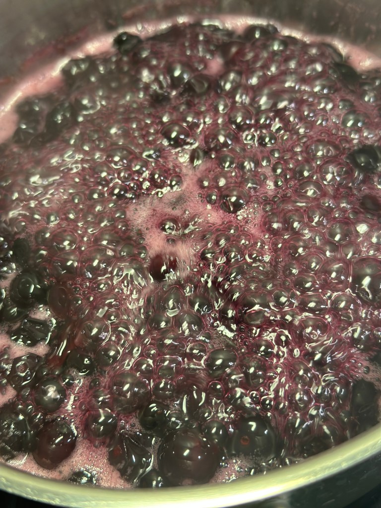 Marmeladen her, er en stor håndfuld blåbær. Vandet skal blot dække bær, og så tilsætter jeg 4-5 spsk økologisk rørsukker (jeg kan bedst lide den med 4 spsk rørsukker, men mere syrlig). Først koger det op, og så simrer det til væden er kogt ind til en lækker sirup – stivner lidt mere når marmeladen bliver kold.