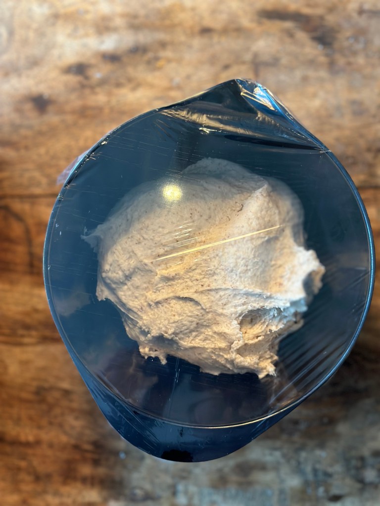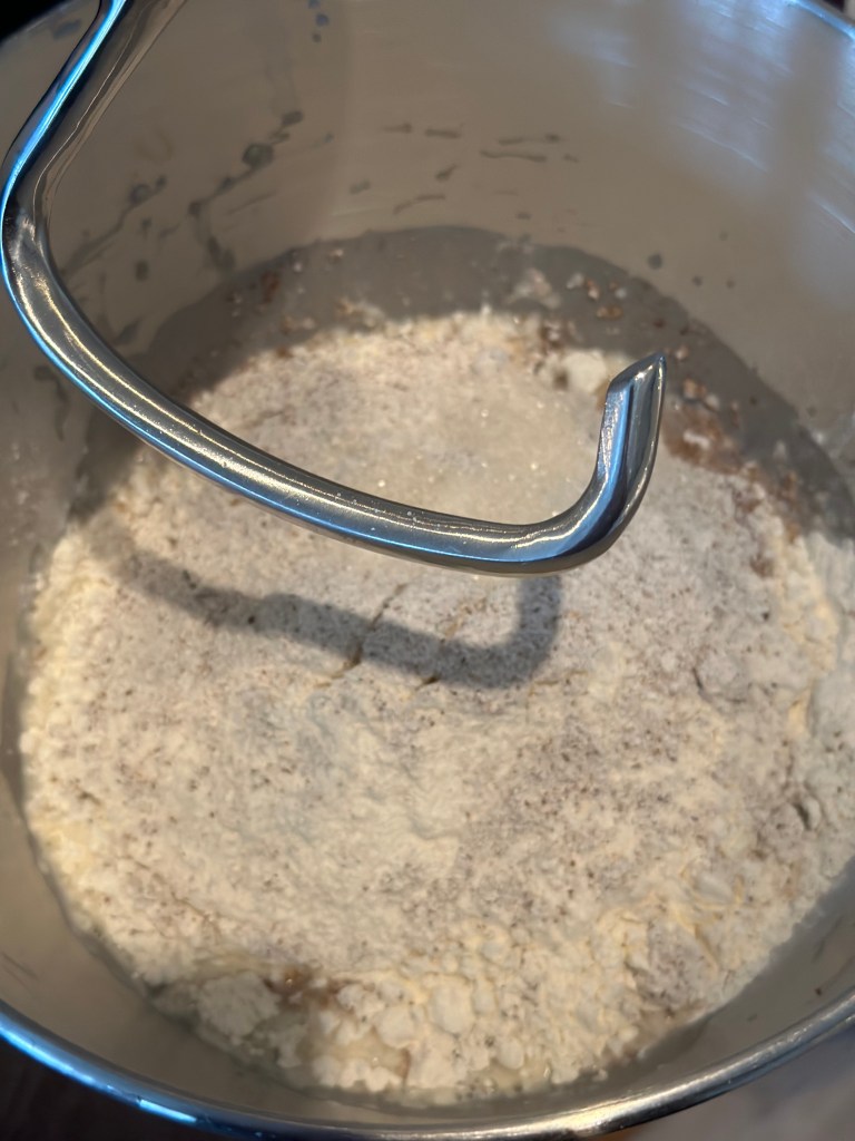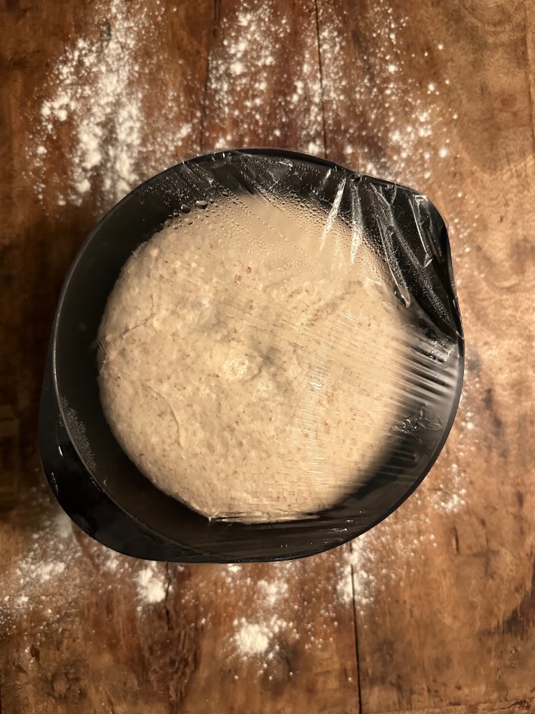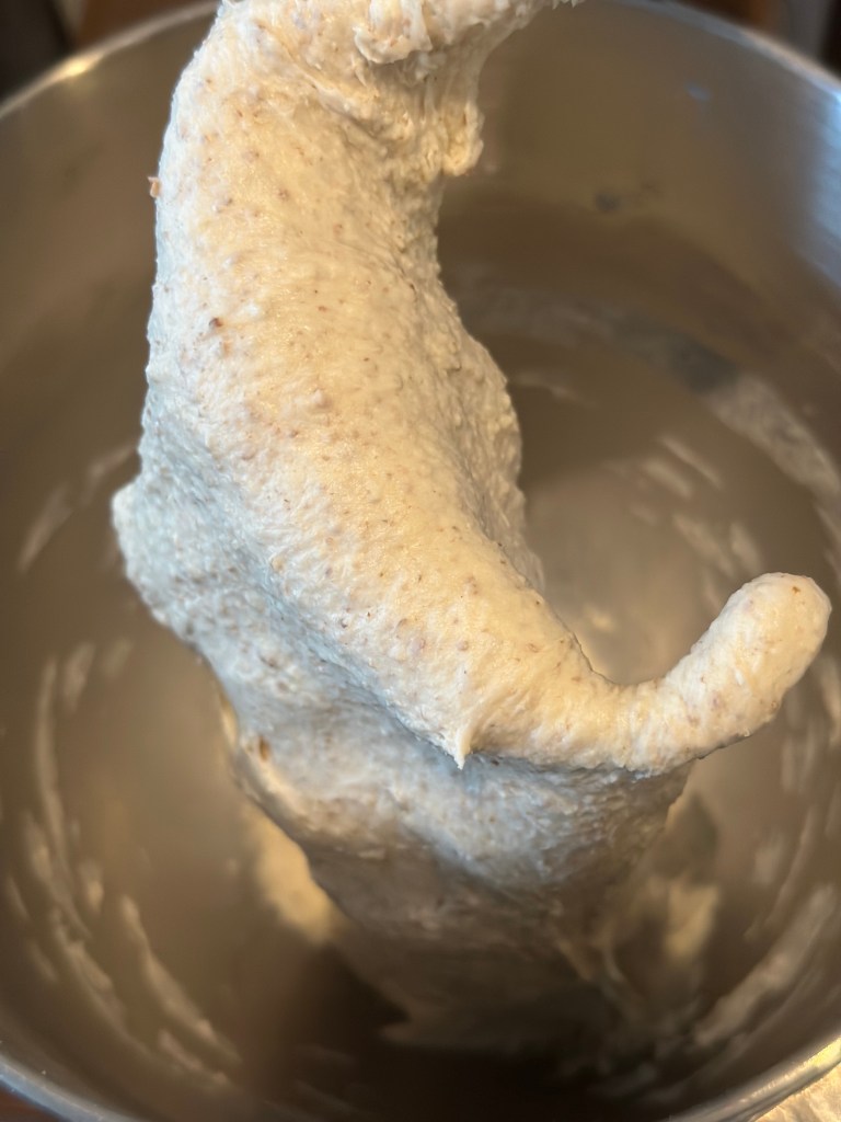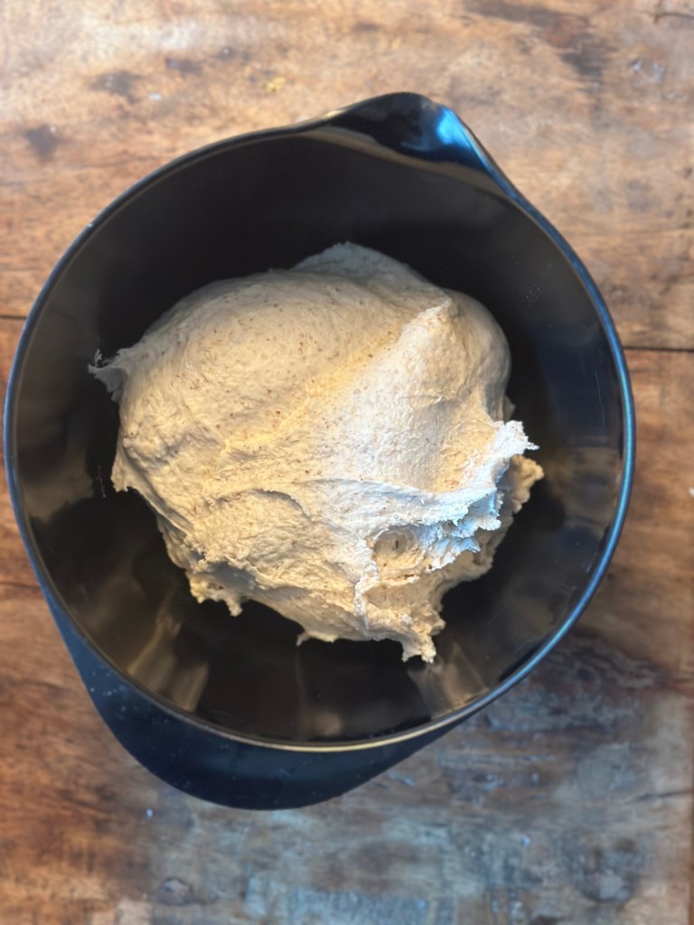 Gæren opløses i vandet, som er lunet ved at blande halvt kogende vand og koldt vand. Herefter opløser jeg salt og sukker og tilsætter til sidst melet og kommer i en røremaskine. Den skal køres i mindst 3-4 minutter.