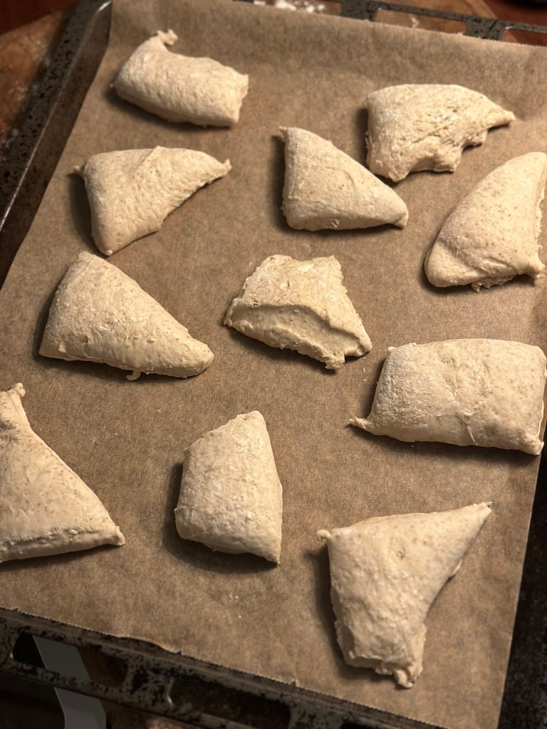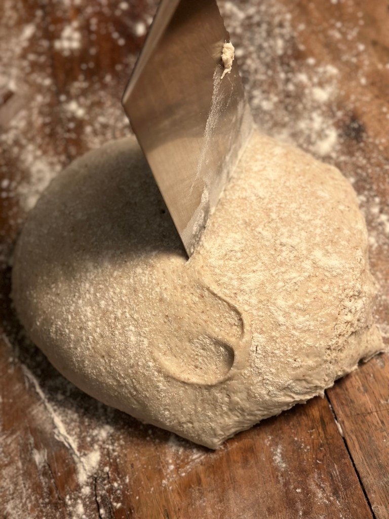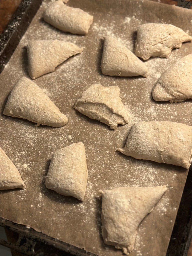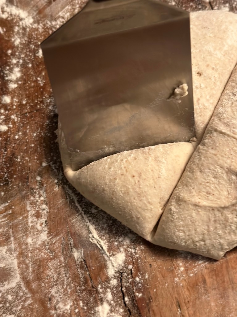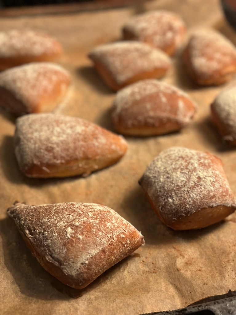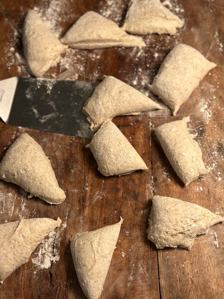 Dagen efter drysser jeg mel ud på bordet, og hælder dejen ud på bordet. Jeg dele forsigtigt dejen i to, og derefter i den størrelse boller jeg ønsker. Jeg lægger bollerne på bagepladen og drysser hvedemel over.