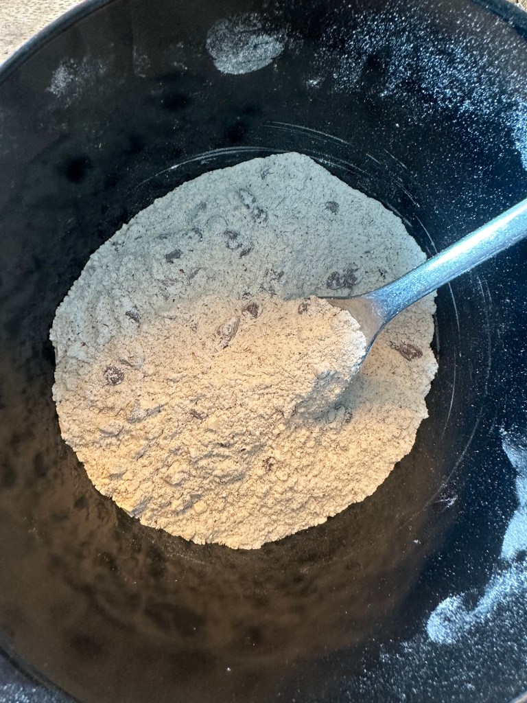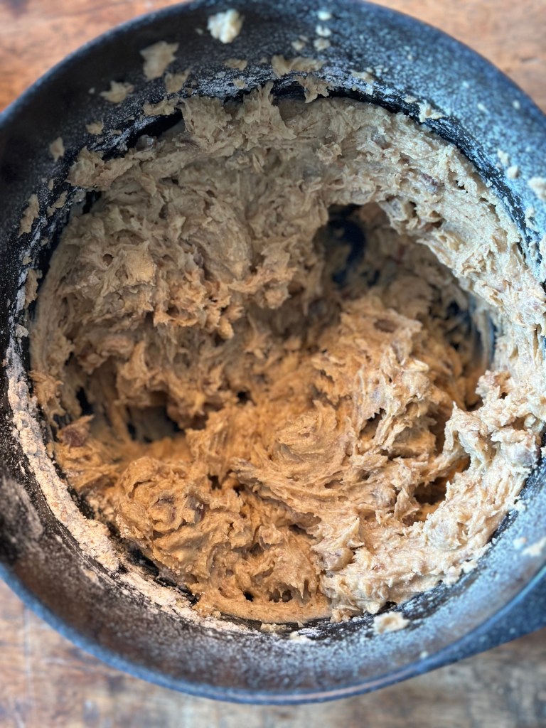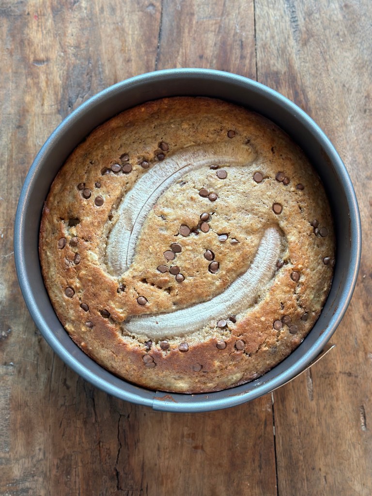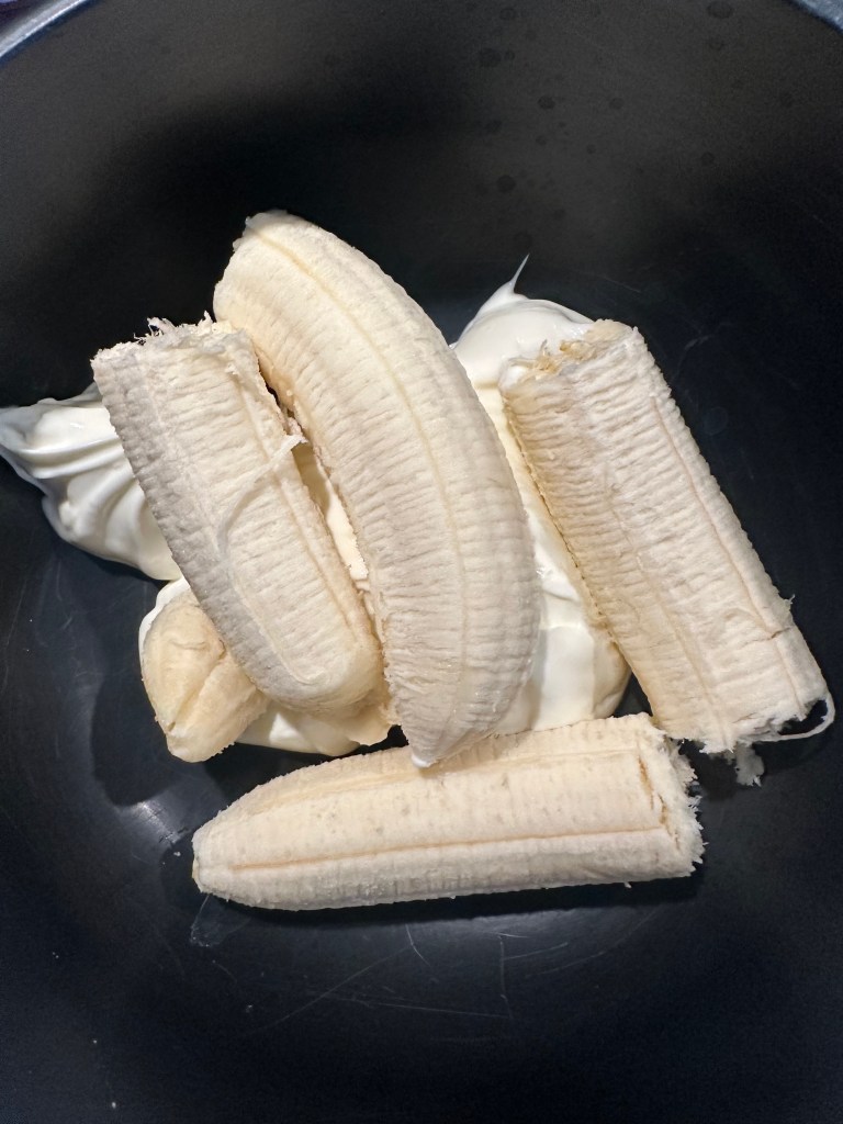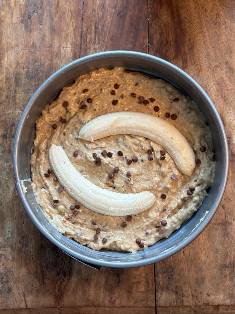 Mos banaerne og tilsæt yoghurten – sæt til side. Bland herefter eller de tørre ingredienser – sæt til side. Piske smørret blødt, tilsæt sukkeret og herefter æggene. Bland de tre grupper sammen, men kun til melet lige er opløst i dejen, da den ellers ender med at blive kompakt.