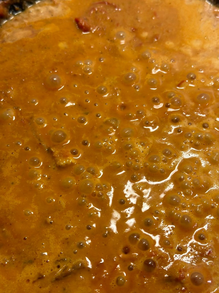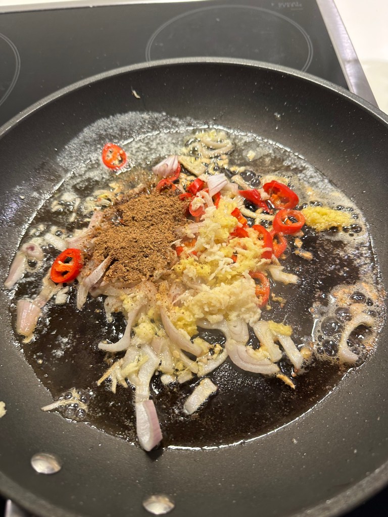 Start med at smelte smøret og kom løg, revet hvidløg, revet ingefær, gurkemeje, garan masala, chili og tomatpure – rist det hele af, så smgene kommer frem.