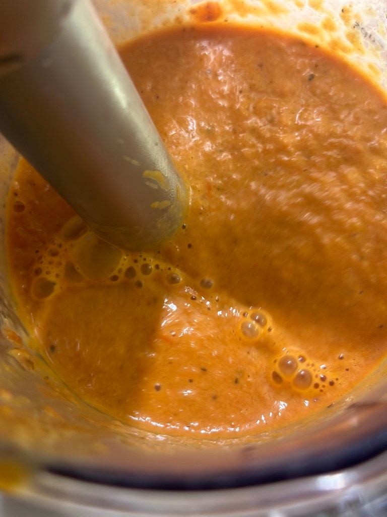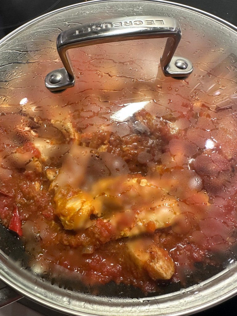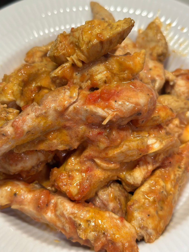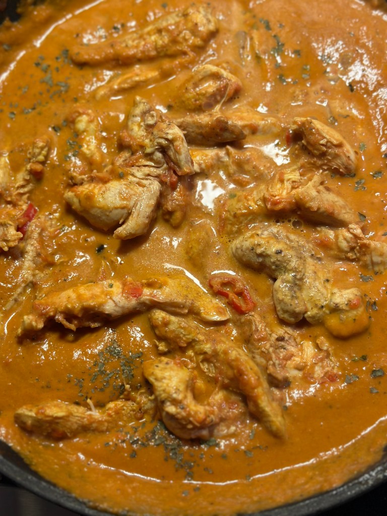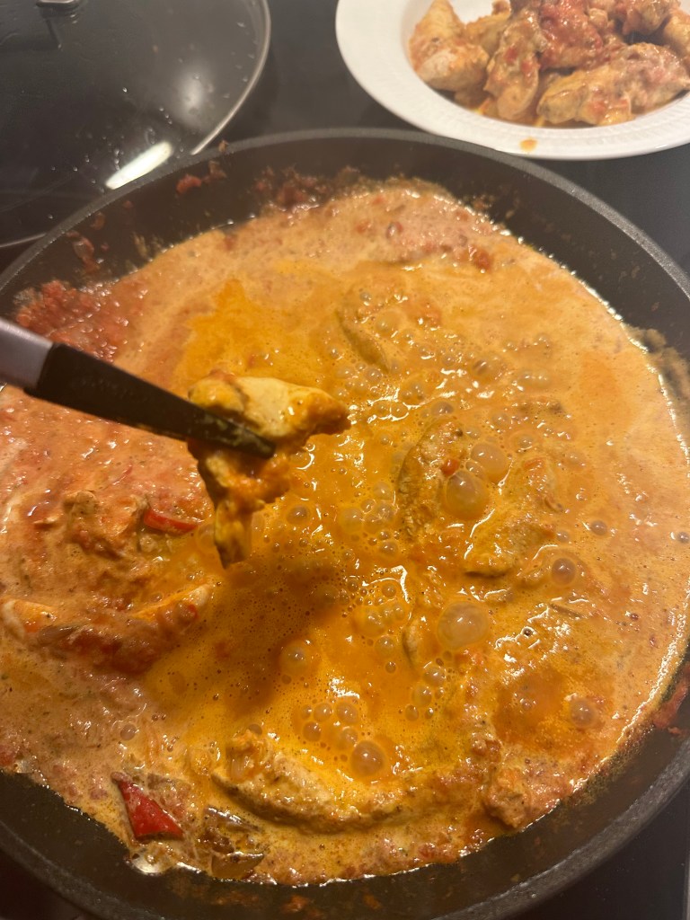 Tilsæt kyllingen og når den er næste gennemstegt, tilsæt flåede og hakkede tomater. Lad det simre lidt. Tilsæt fløde. Lad det arbejde ved mellem varme i 10 minutter. Tag herefter kyllingen op, og blend saucen jævn. Smag til med salt og peber, og tilsæt kyllingen igen.