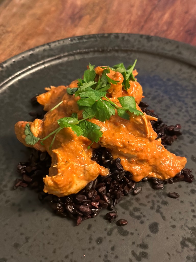 Jeg serverer med sorte ris og friske koriander. Hvide ris fungerer også.