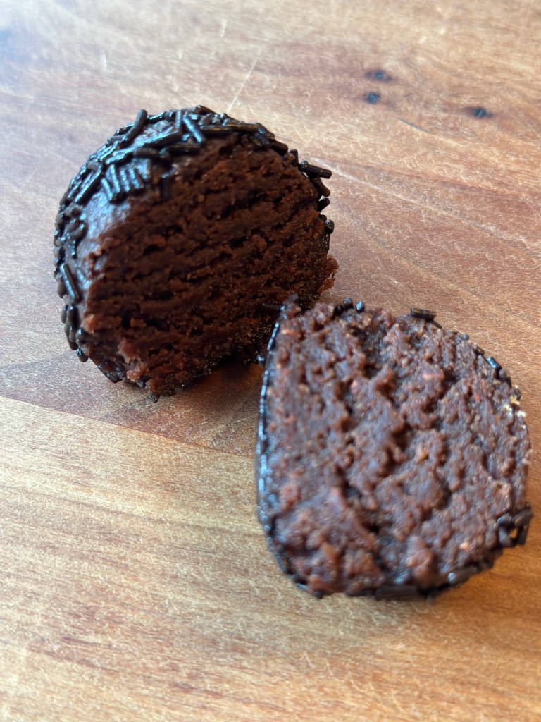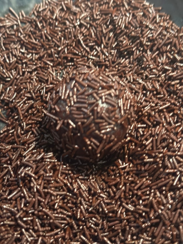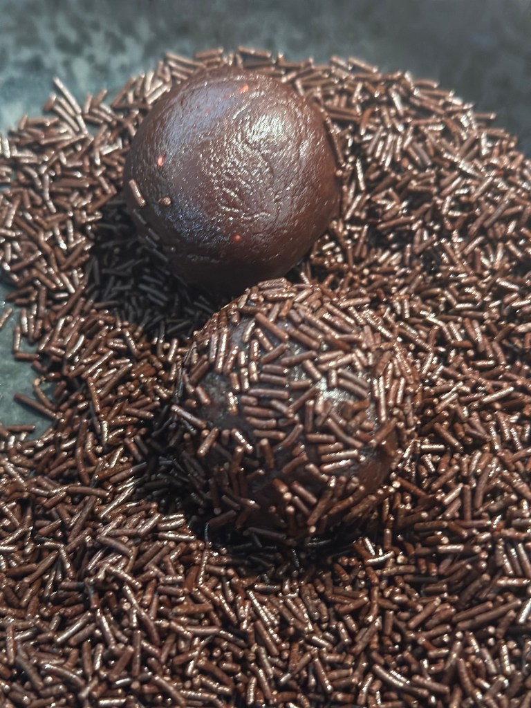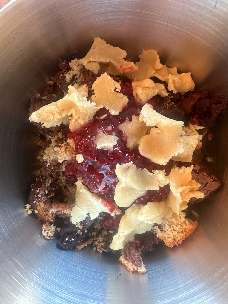 Det hele æltes sammen i en røremskine – brug “spaden”. Dejen deles i 4 lige store dele, igen i 4 og igen i 4 og så ledes kommer der 32 romkugler ud af dejen (du kan skallere ned, hvis det er for mange). Kuglerne er bløde og fedtede og det er perfekt. Rul dem i chokolade krummel – men da krumlen bliver fedtet, så skift krummet en gang eller to. Du skal være omhyggelig med krumlen, så den sidder godt fast. Herefter skal de på køl i mindst 2 timer inden servering, og skal de gemmes, skal det også være på køl.