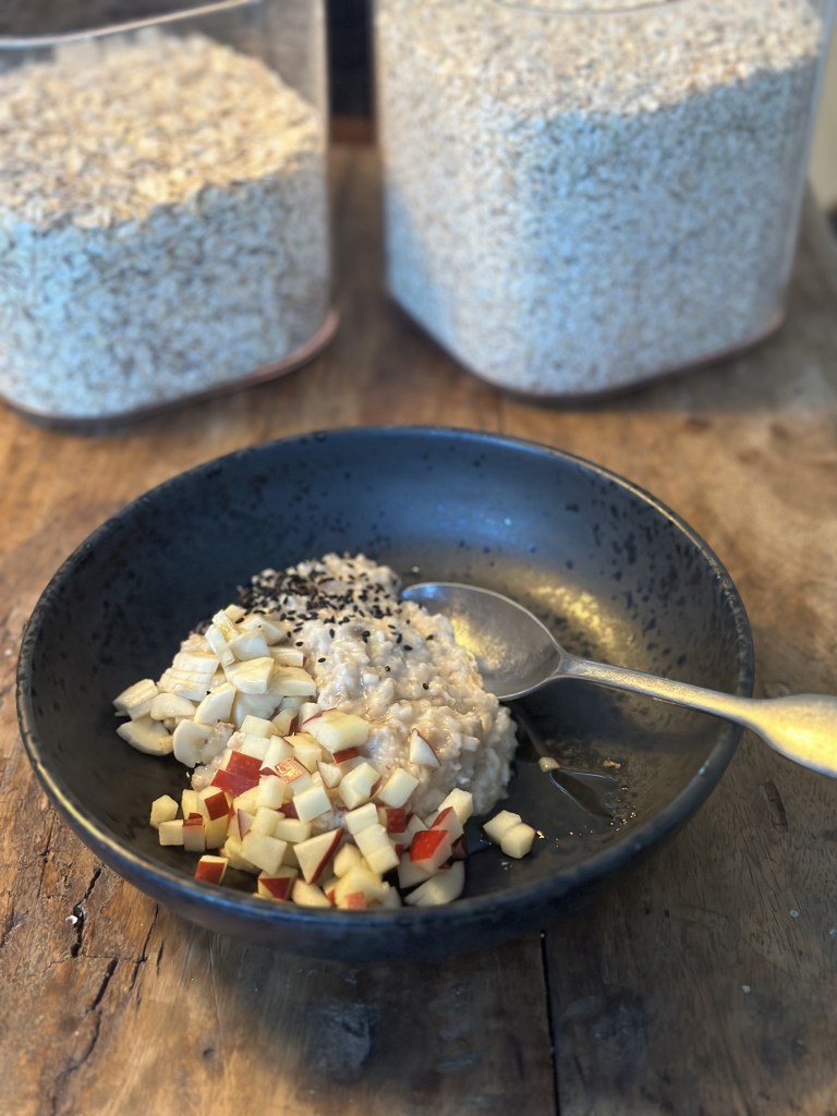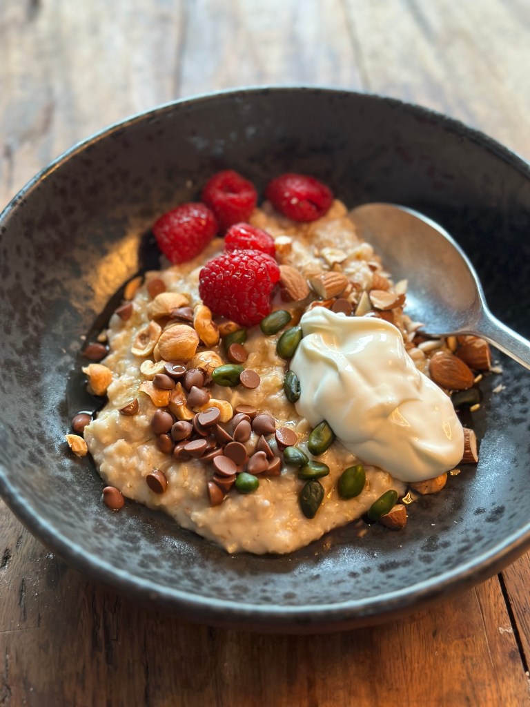 Jeg spiser den med blandet toppings. Hakkede æbler går rigtig godt sammen med, lidt Valhrona chokolade drops og sirup. Nødder er perfekt eller syrlige bær. En klat græsk yoghurt er også perfekt.