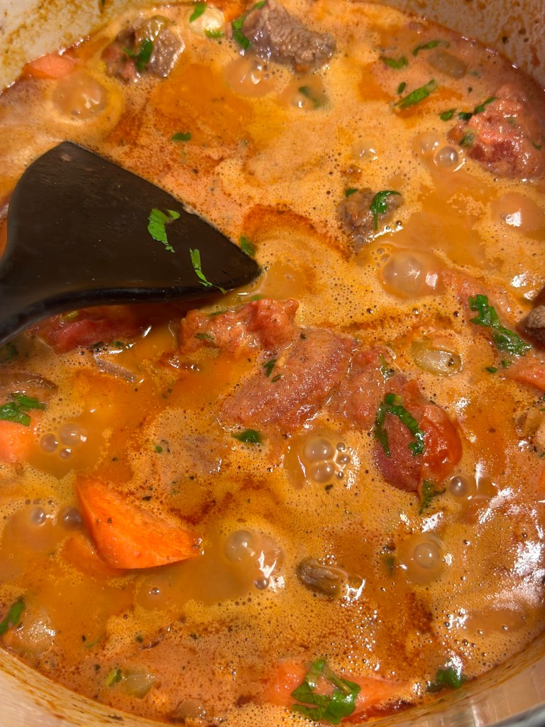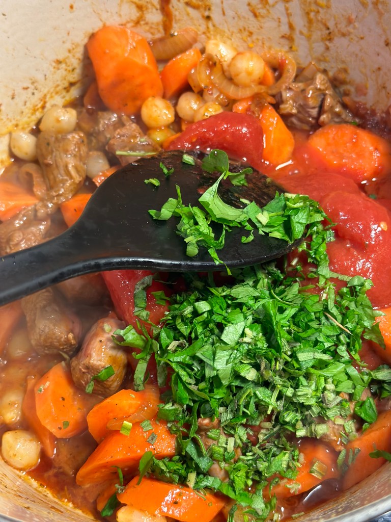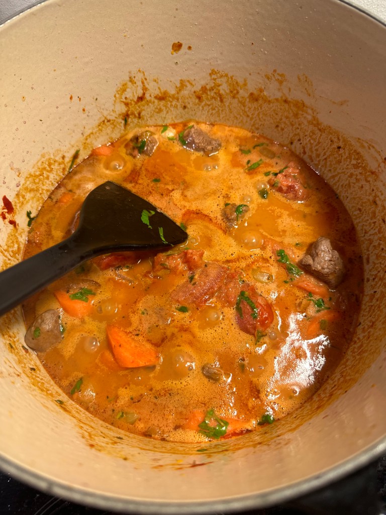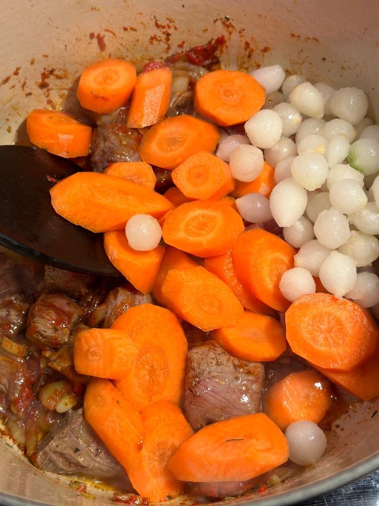 Braisere løg, hvidløg, krydderier og tomatpure sammen med lammet. Tilsæt gulerødder og perleløg. Tilsæt flåede tomater – og vælg en god kvalitet. Tilsæt rødvin og fløde. Tilsæt krydderurterne og når det hele har simret lidt, smag til med salt og peber.
