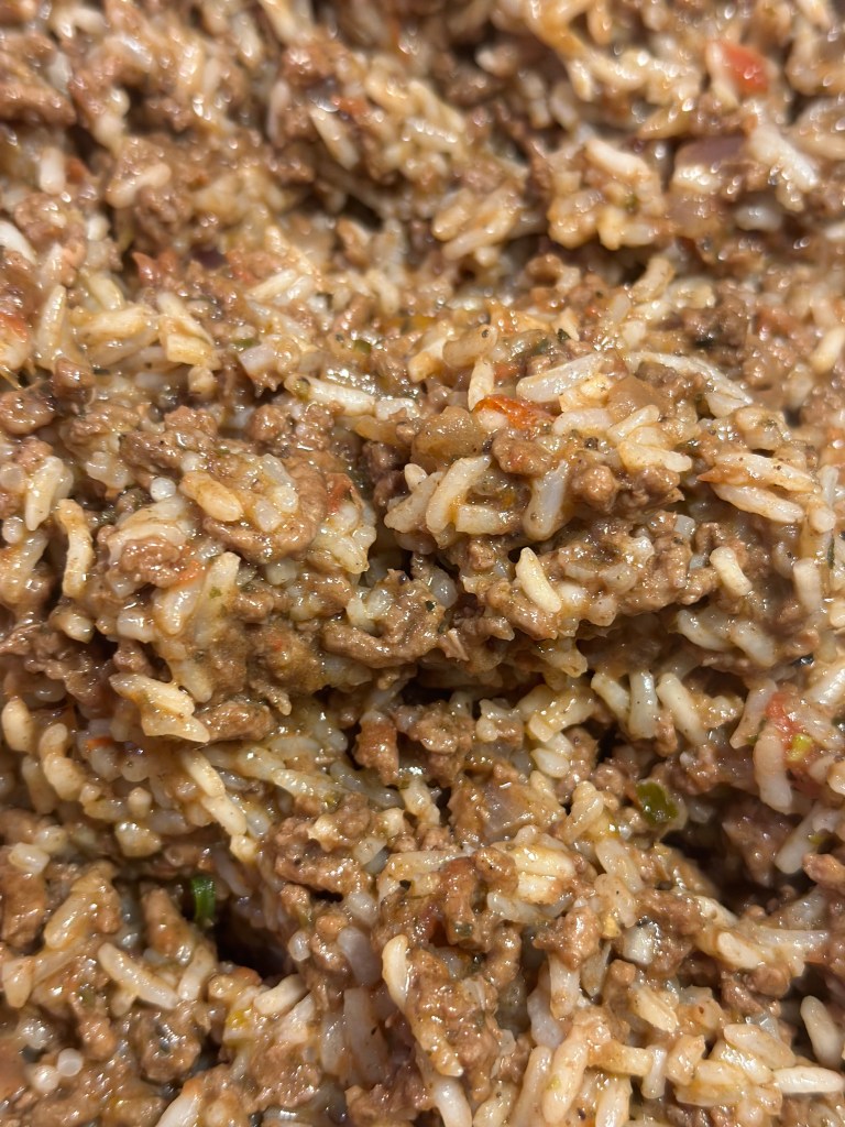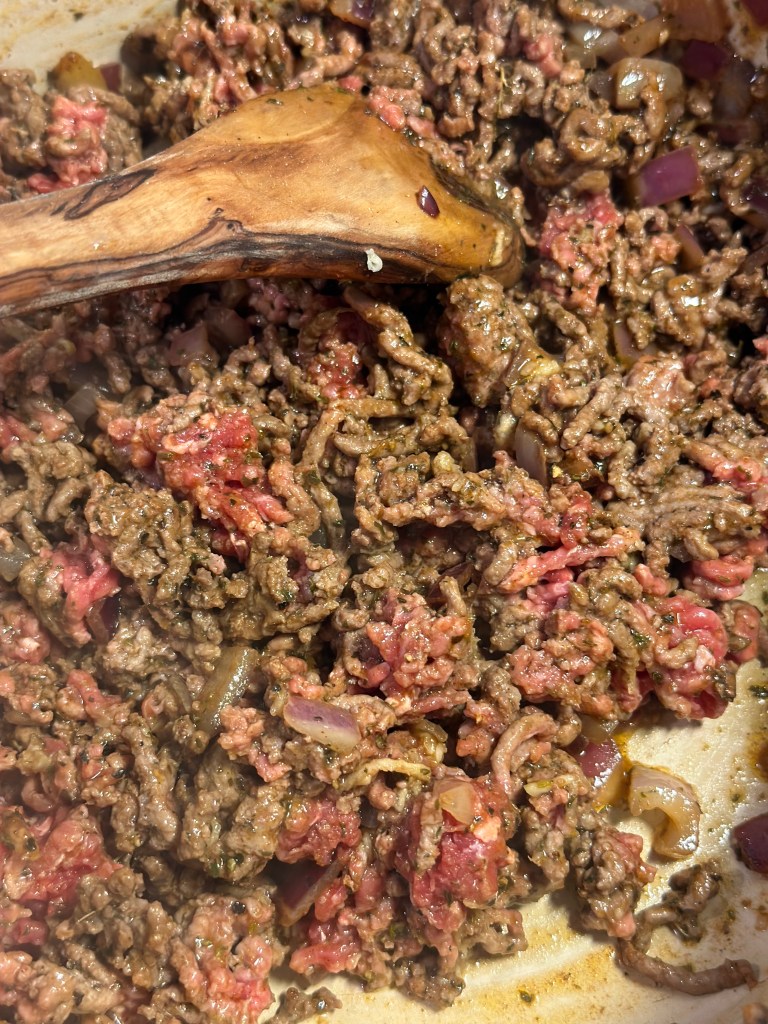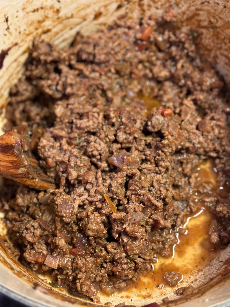 Smelt smør i olivenolien – en spsk af hver. Tilsæt løg, hvidløg, tomat pure og de tørrede krydderier. Tilsæt oksekødet og brun det. Tilsæt flået tomater, rødvin, fløde og krydderurterne. Lad det simre lidt og smag til med salt og peber. Da peberfrugten eller tomaten udligner kraften i fyldets smag, så sørg for der er god smag i fyldet.