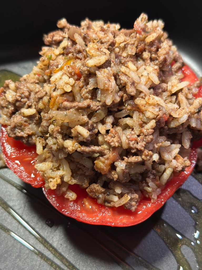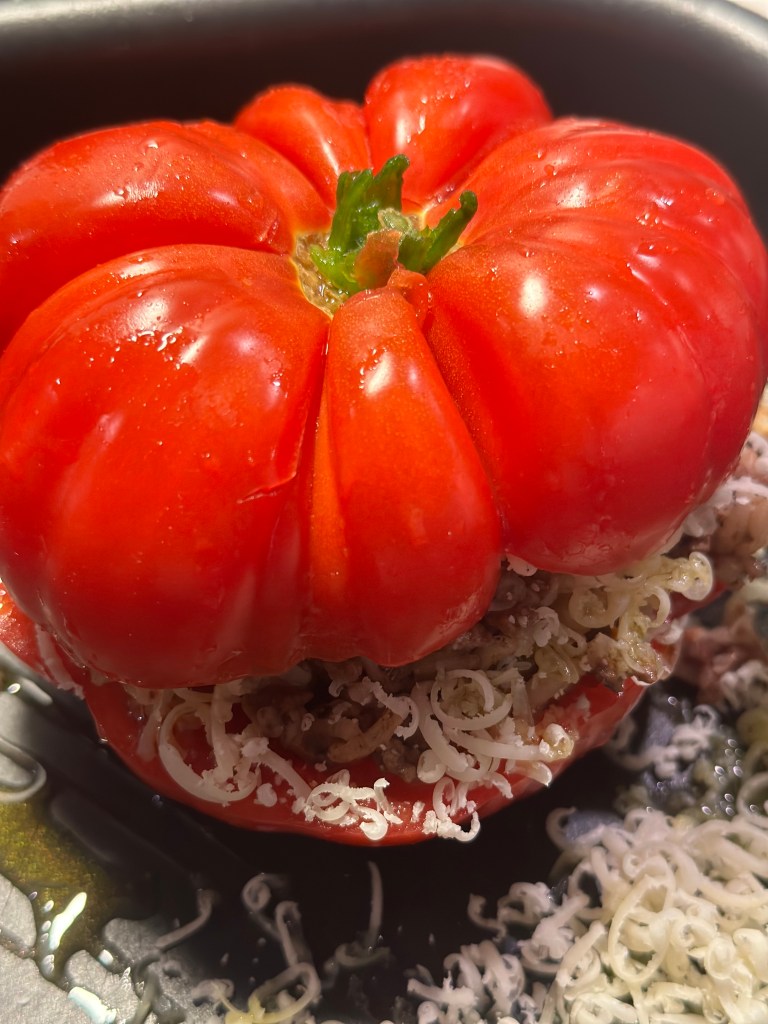 Skær tomaten eller peberfrugten over og fjern indmaden. Stilk må godt blive på. Monter fyldet og drys med revet parmesan. Sættes i ovnen ved 180 grader i 25-30 minutter
