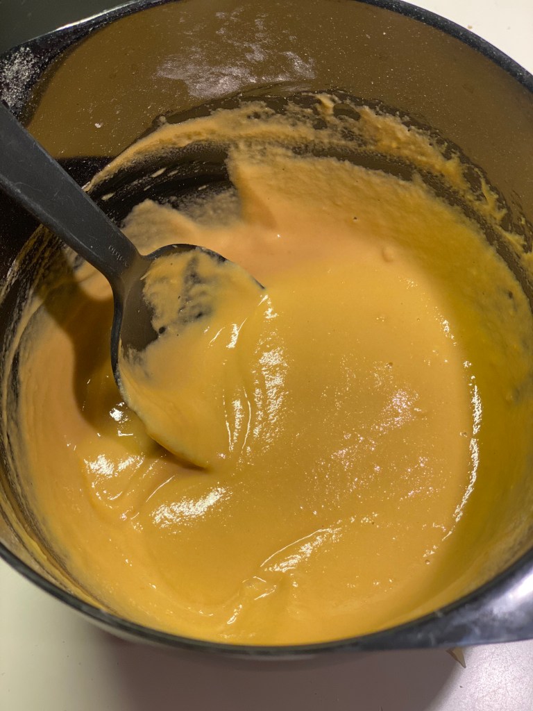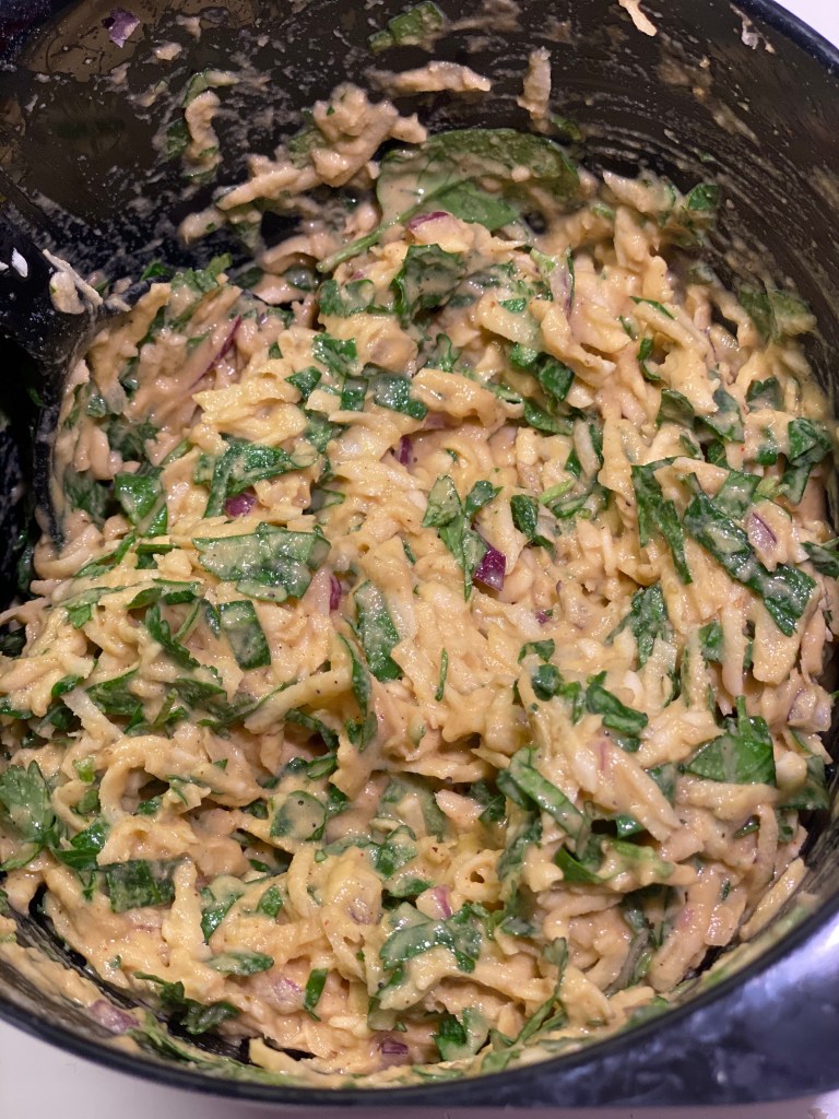 Jeg starter med basen, som er kikærtemel, vand og æg som jeg pisker sammen til en jævn dej. Jeg skræller og river pastonak og persillerod. Tilsætter resten i dejen, og blander det godt.
