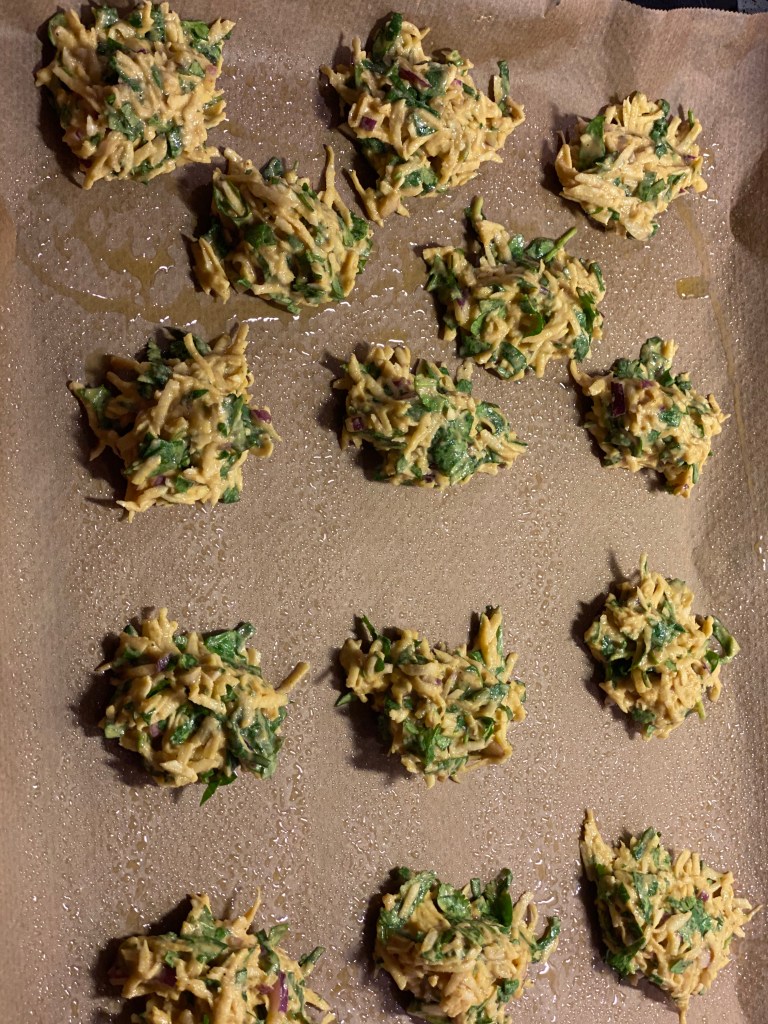 Lægger op i ikke for store klatter på en bageplade. Sprayer bagepladen inden med hvidløgsolivenolie og efter – men ikke for meget.