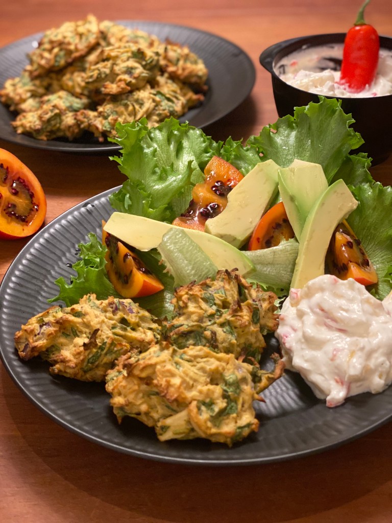 Jeg har lavet en chili/mango dressing på laktosefri græsk yoghurt. Krølsalat, avocado og trætomat (tamarillo).