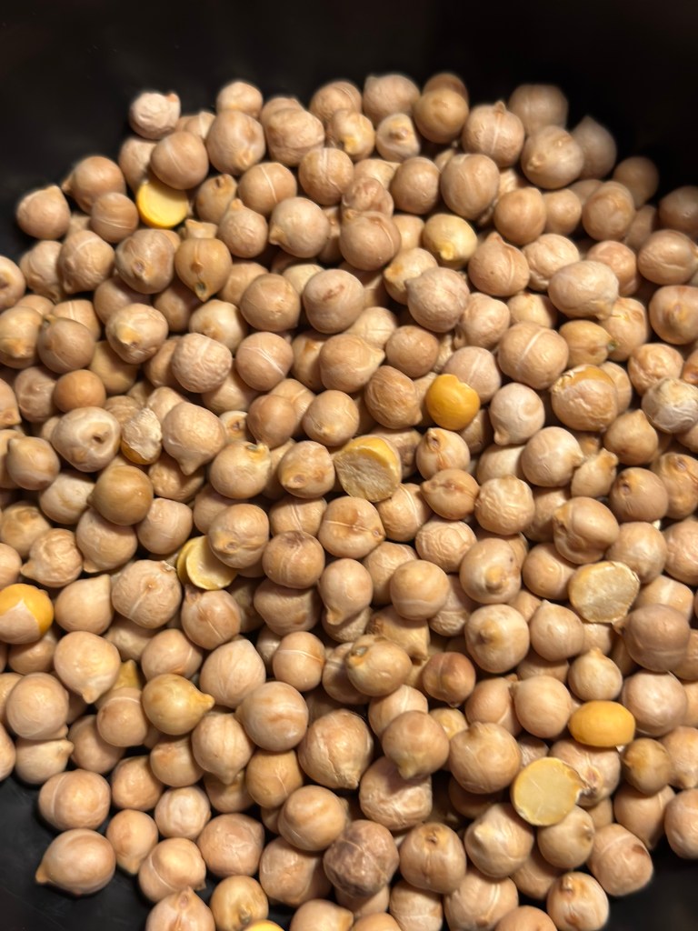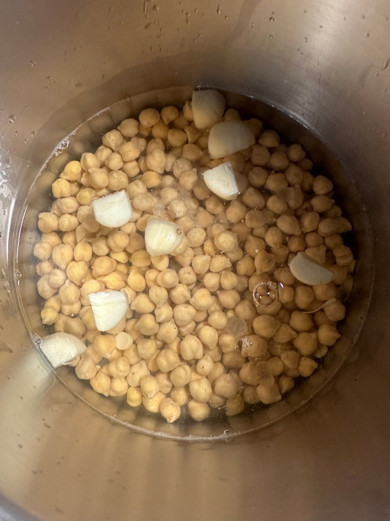 Jeg lægger kikærterne i en gryde, og her kan du sagtens lave en stor mængde, da de færdigkogte ærter kan fryses ned, og bruges senere – ligeså nemt som med dåse kikærter.
