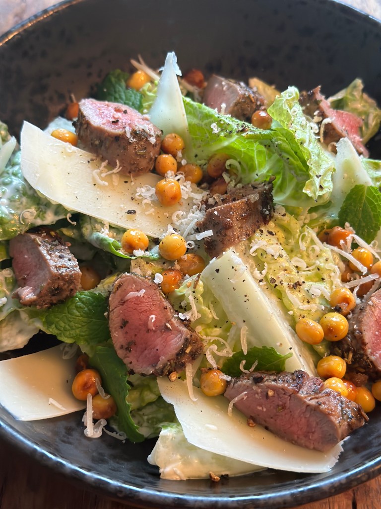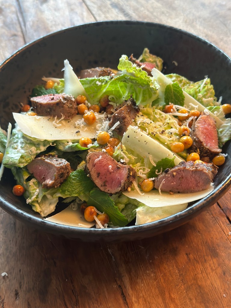 Jeg bruger romainsalat som i den originale. Du kan vælge at servere den på hele blade eller rive salaten i stykker. Begge dele fungerer. Romainsalaten skal vaskes, men også tørres for dressingen ikke udvandes og mister smag. Dressingen hæfter også bedre således. Dressing og romainsalaten blandes. Herefter monteres lamme mørbrad, og kikærter (se opskrift på kikærter her). River parmesan og river lidt af den som pynt. Pyntes i øvrigt med lidt limeblade for et frisk tvist.