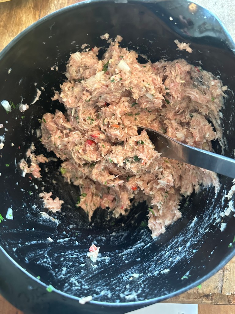 Det hele røres godt sammen, og jeg plejer altid at lave en enkelt test på panden, og lige smage til med salt og peber.