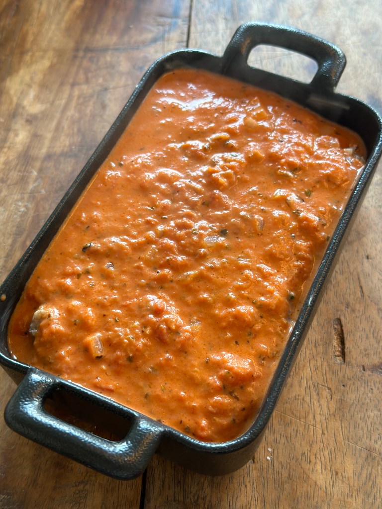 Svits løgene i lidt olivenolie/smør. Tilsæt tomatpure og krydderier. Tilsæt fløde.