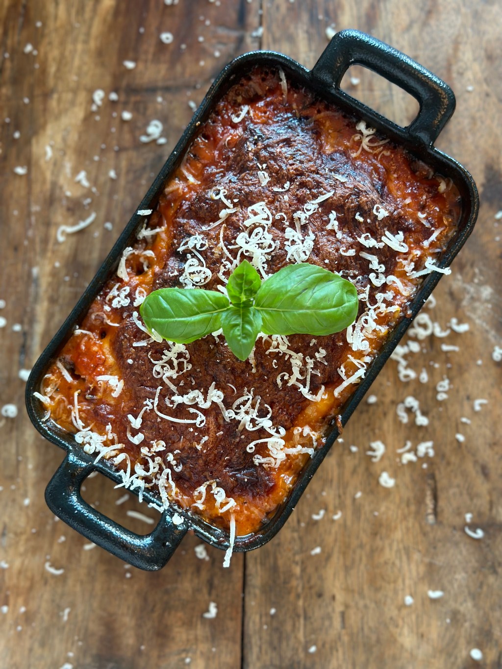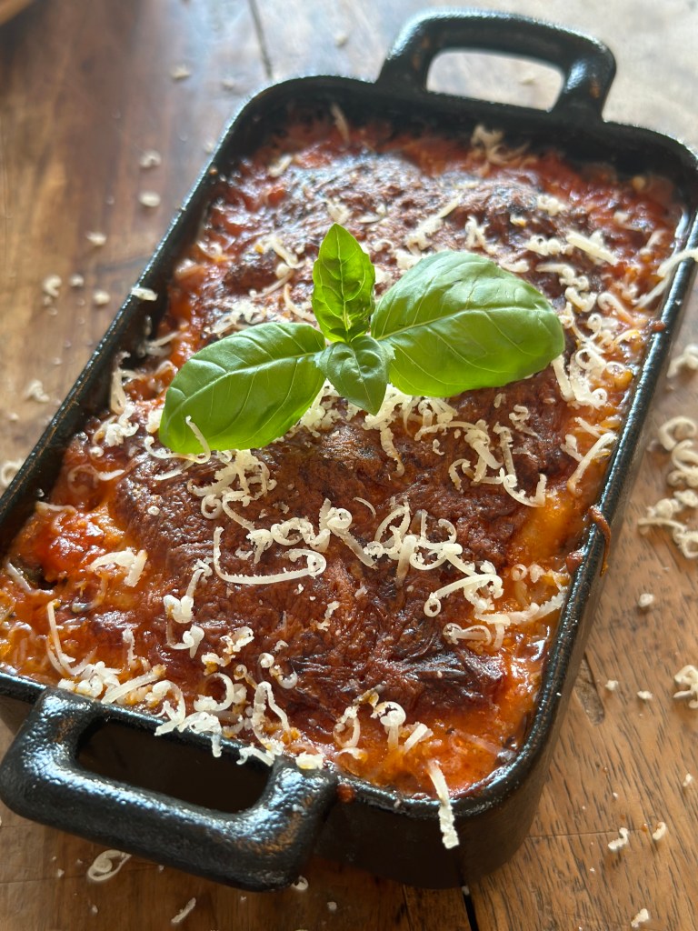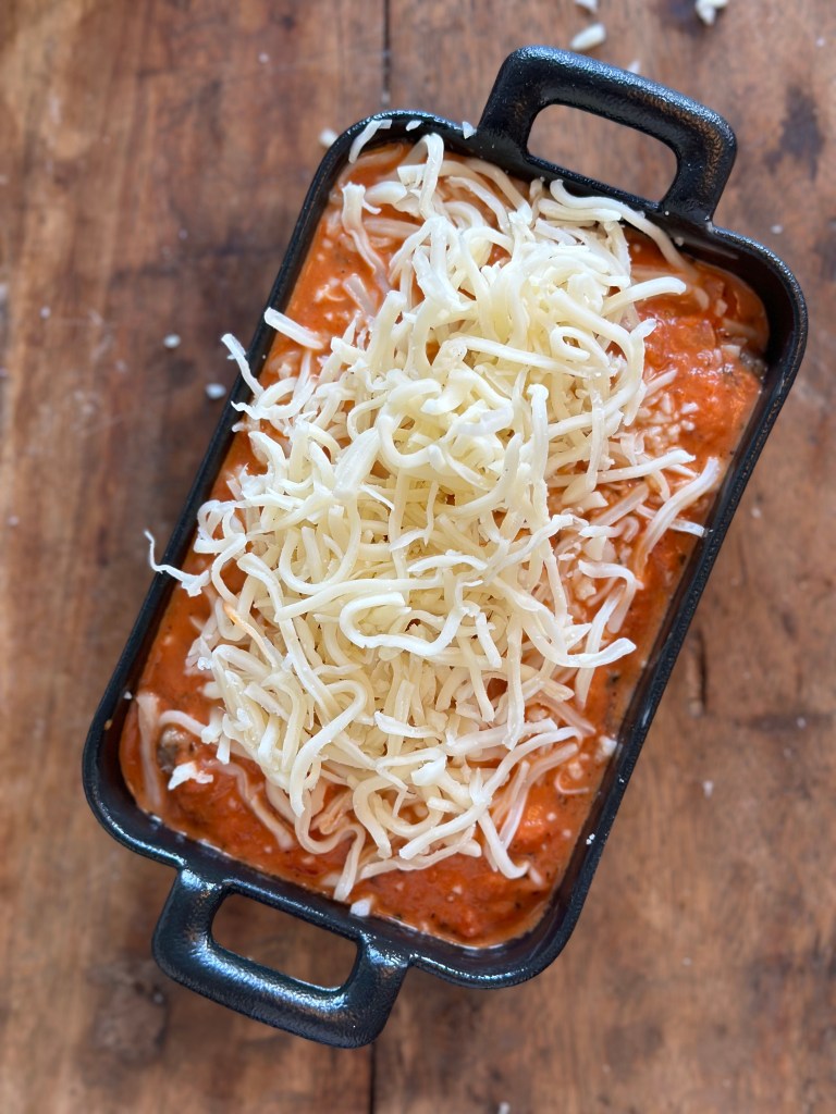 I et fad placerer man Cannelloni med fyld (forkogte). Hæld tomat saucen over således den dækker helt. Tilsæt lidt revet parmesan.