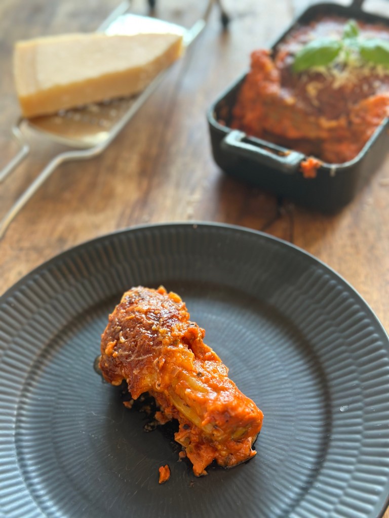 Oprindelig lavede man et svøb af lasagne plader, men med tiden er disse rør kommet til. Afhængig af tykkelsen, så er bagetiden lidt forskellig. 35 minutter er nødvendig for de bliver møre i tomatsaucen. Alternativt kan du vælge at koge dem først.
